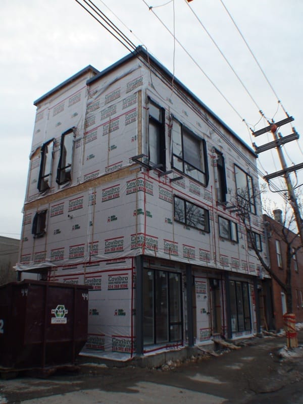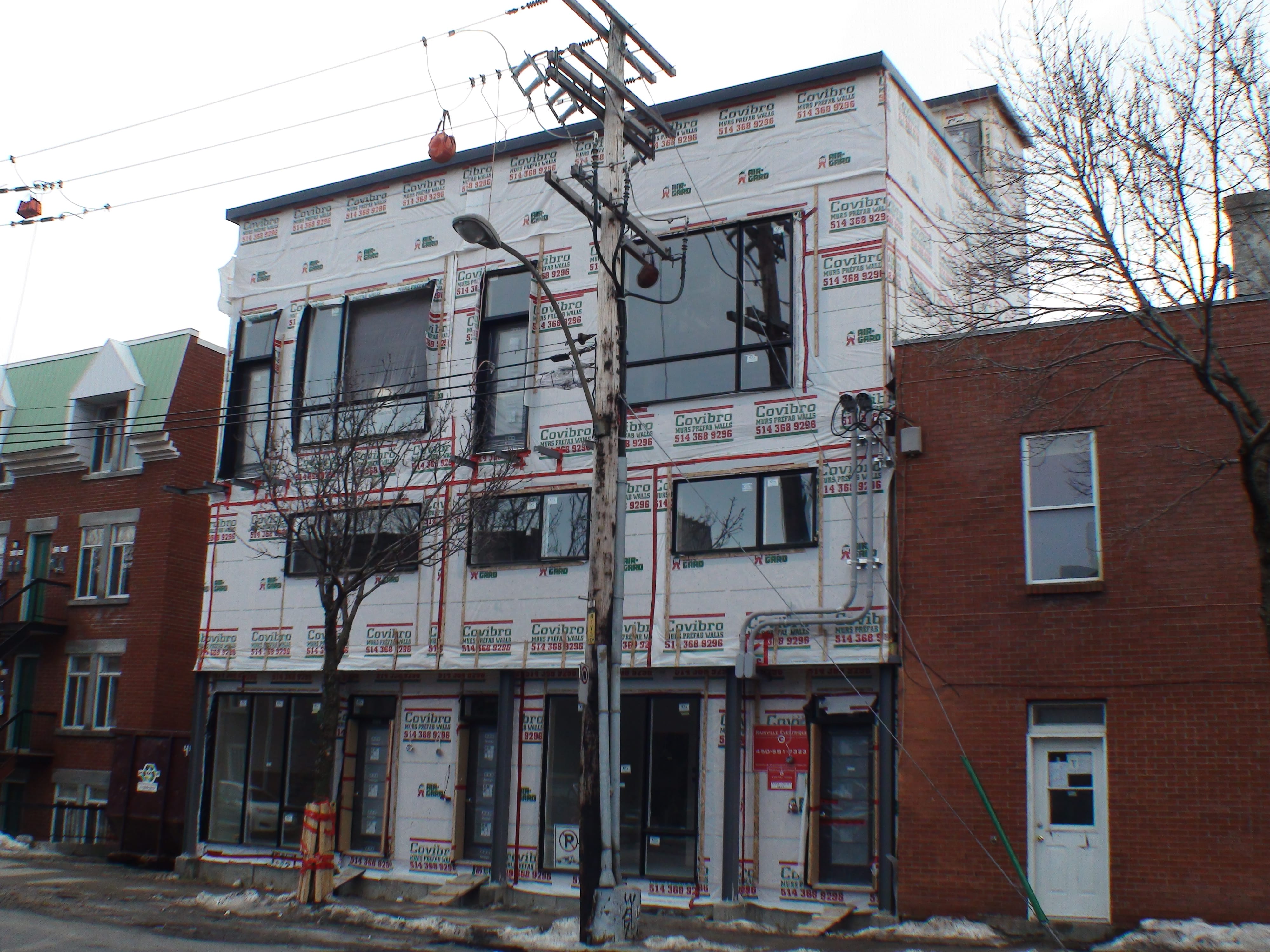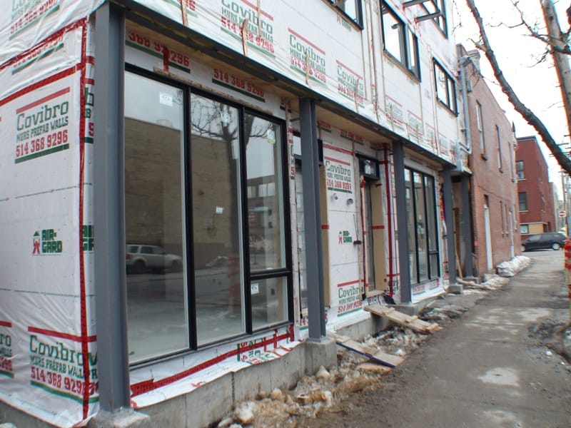 Il va de soi que la réalisation d’un projet d’agrandissement, bien qu’il s’agisse de rénovation de bâtiment existant, demande les mêmes étapes qu’un projet de construction neuve. Dans le cas de cet agrandissement à vocation résidentielle et commerciale, la première étape de travaux aura bien évidemment été celle des travaux d’excavation et de construction des fondations de l’immeuble. Une fois les travaux de coulage de béton réalisés, le temps est venu de débuter les travaux de construction des éléments de charpente du bâtiment. Pour ce projet, les promoteurs ont décidés d’utiliser l’acier ainsi que des panneaux préfabriqués pour construire une bonne partie de la charpente murale de l’immeuble. Bien évidemment, plusieurs travaux de menuiserie générale ont aussi été nécessaires à la construction des planchers, de la structure de la toiture de l’agrandissement de même que pour les travaux de construction des divisions intérieures. Comme vous pouvez le remarquer sur la photo qui suit, des colonnes de métal on été utilisées à titre d’éléments de portance pour une poutre, elle aussi fabriquée d’acier, qui a pour fonction de permettre l’insertion des panneaux pré-fabriqués aux endroits voulus sans que ceux-ci ne soit soient pour autant porteur. Il en va de même pour les portes et les fenêtres de l’agrandissement. Elles auront été installées une fois les travaux de mise en place des éléments de murs réalisés.