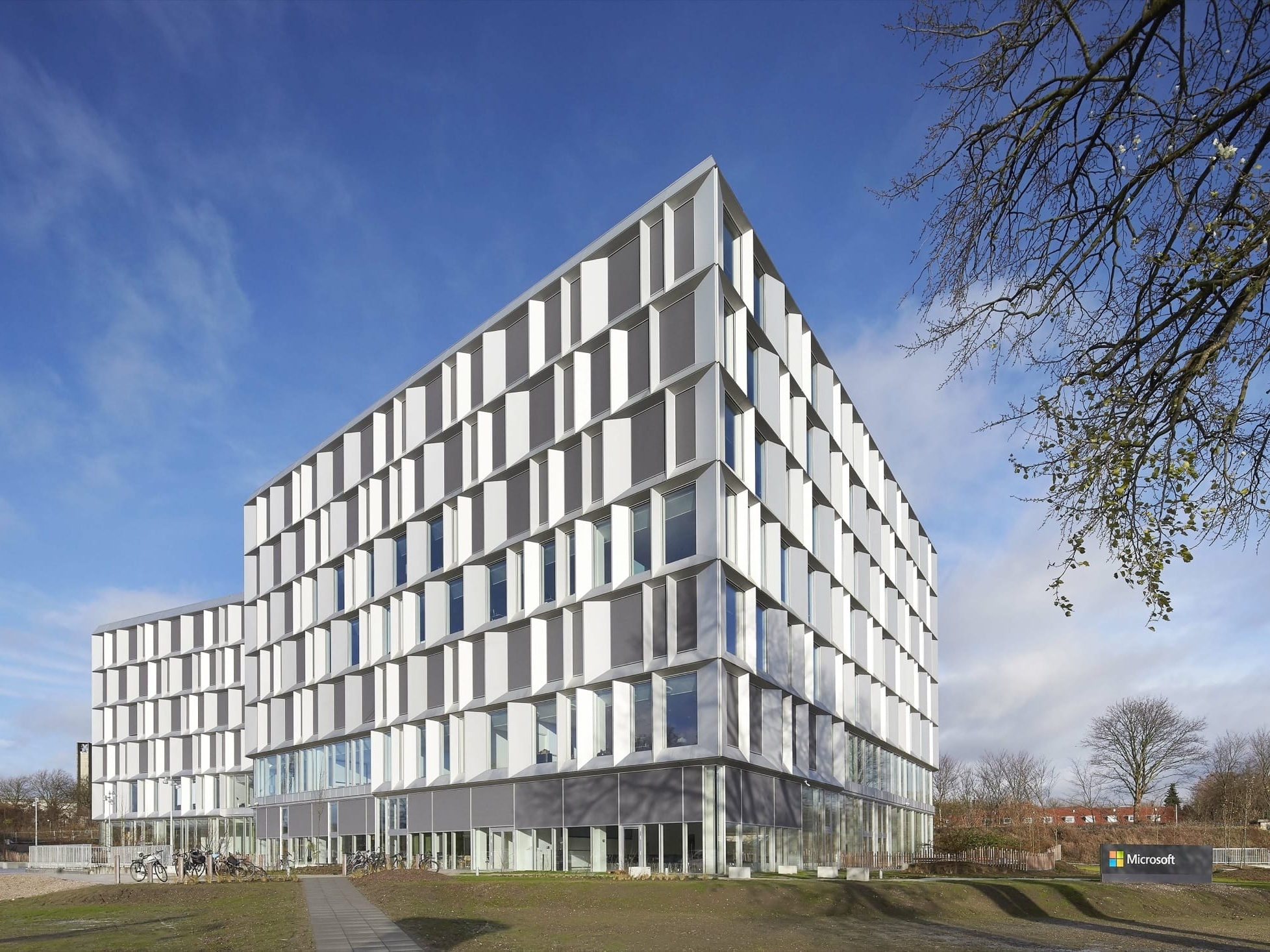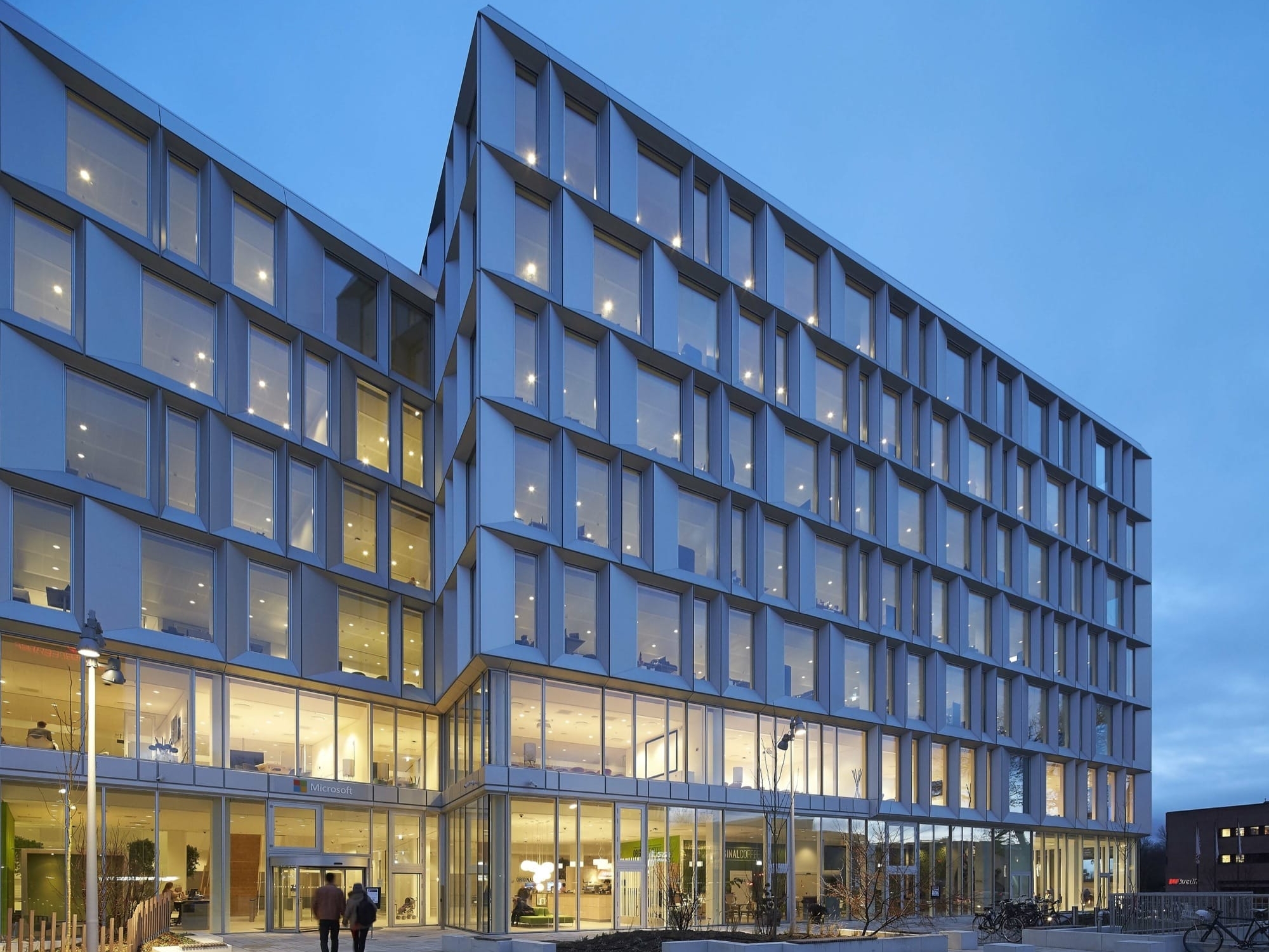 Les architectes de chez Henning Larsen Architects racontent qu’ils se sont inspiré de la philosophie de travail de Microsoft pour concevoir leurs nouveaux bureaux danois. L’architecture des lieux reflète effectivement la coopération et le partage du savoir qui sont au coeur des valeurs de Microsoft : deux édifices sont reliés par un immense atrium surplombé d’un toit de verre qui offre plusieurs espaces facilitant les échanges entre les différents départements. La forme pyramidale de l’atrium a l’avantage de procurer plus d’intimité aux étages supérieurs et d’ouvrir grands les espaces des étages inférieurs. Lumineux, versatiles et invitants, les bureaux de Microsoft comprennent des salles de conférence de toutes tailles ainsi que de grands auditoriums. À chaque étage, les employés peuvent se réunir dans une aire commune qui comprend une cuisine, des jeux et des divans. Tous les bureaux sont situés le long des façades pour que chacun profite de la lumière du jour tout au long de la journée. L’omniprésence du bois, la finesse et la modernité du mobilier, l’importante luminosité et l’impressionnant atrium font de ces bureaux un endroit inspirant et chaleureux.