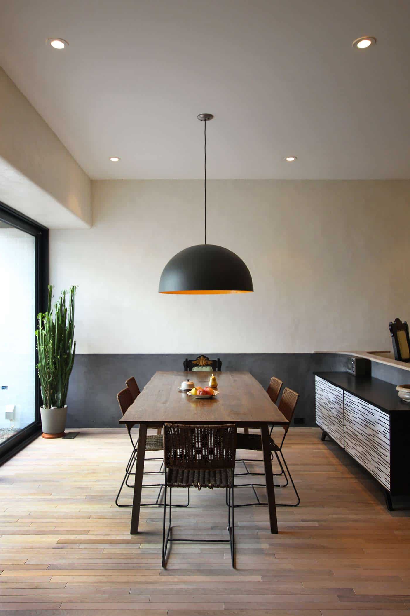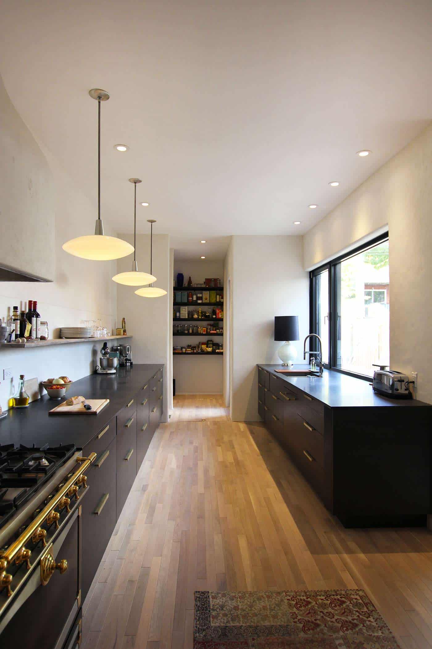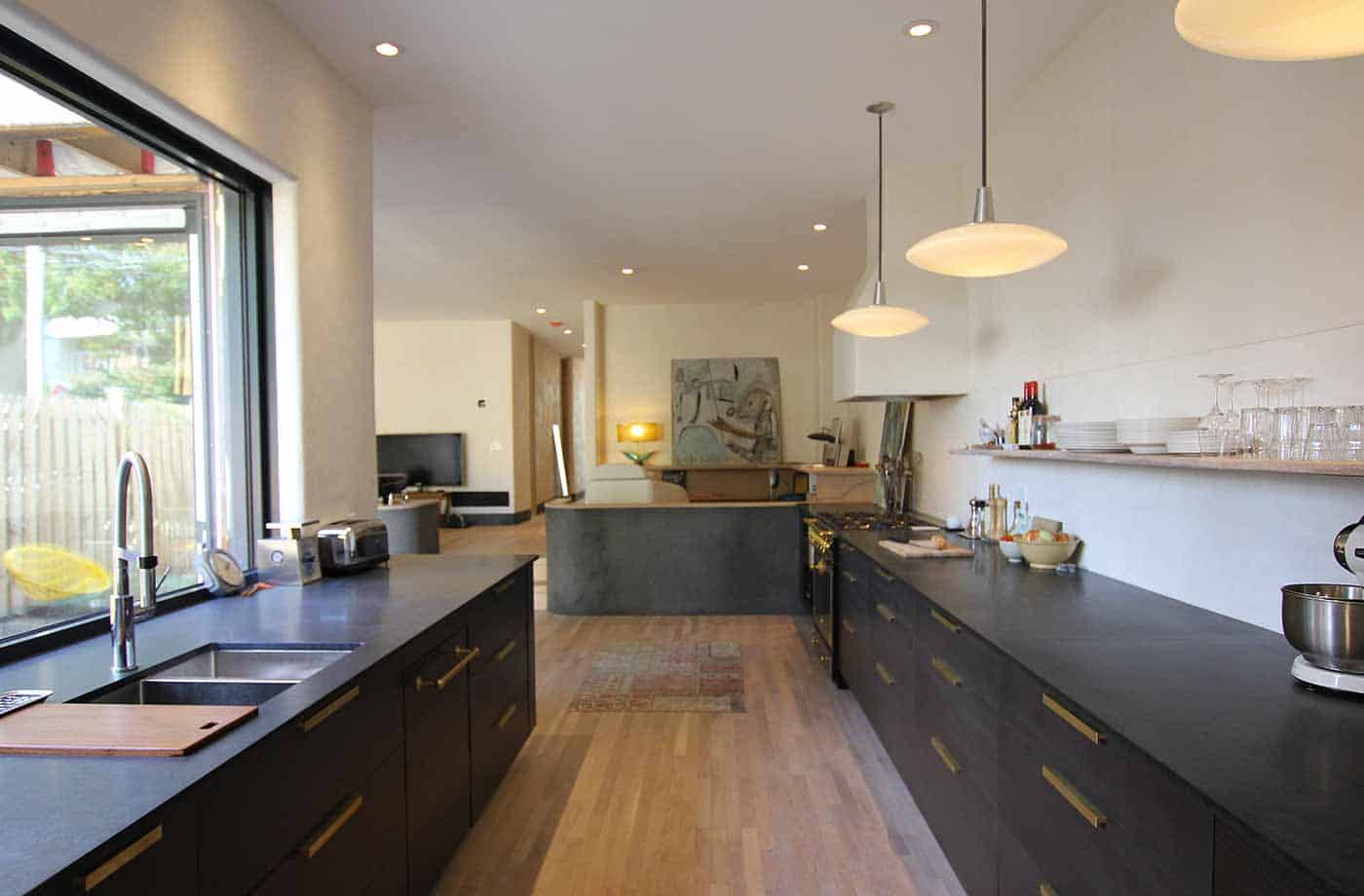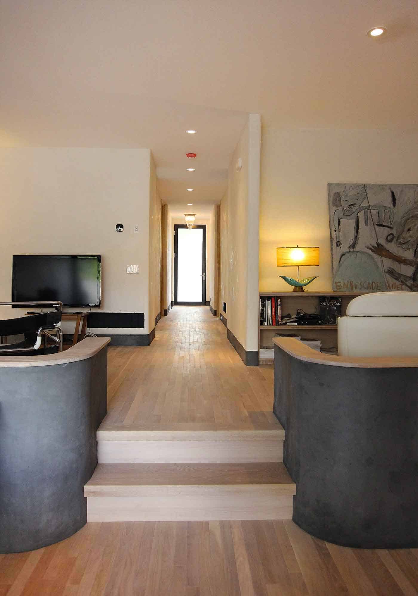 Dès l’entrée, de part et d’autre du couloir, on accède aux deux chambres ainsi qu’à la salle de bain. Le passage mène à une grande aire ouverte sur deux niveaux, comprenant bureau, salon, cuisine et salle à manger. Elle donne sur une cour arrière que borde une clôture en maçonnerie, dans laquelle nous avons pratiqué des ouvertures pour y installer des fenêtres extérieures. L’espace restreint de la cour complexifiait d’ailleurs considérablement le processus d’excavation et d’agrandissement.