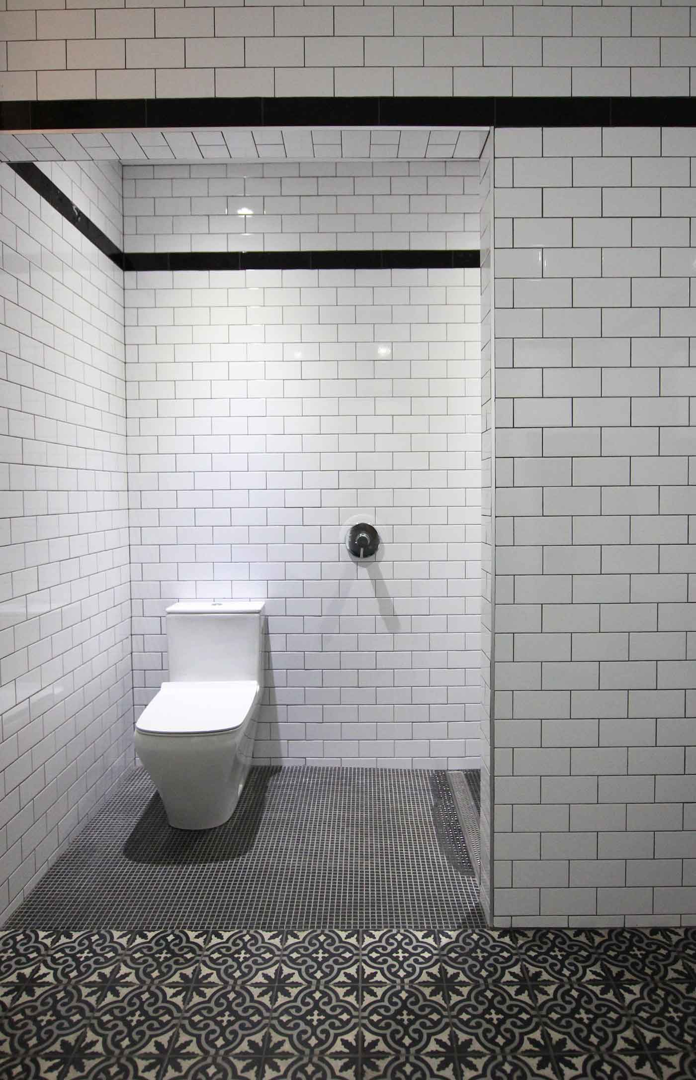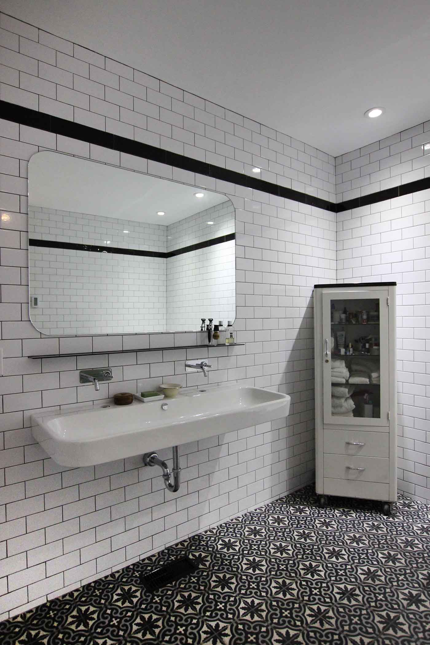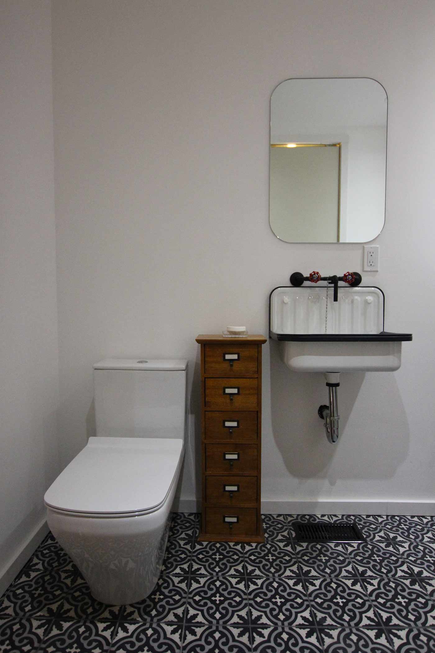 La vaste salle de bain au charme raffiné, et dont l’esthétique rappelle les salles d’eau d’une autre époque, est ornée de céramique blanche au mur et d’élégantes tuiles de ciment noires et blanches au sol. Juste en face a été aménagée une coquette buanderie, dont le style fait écho à celui de la salle de bain, et où se trouve une seconde toilette.