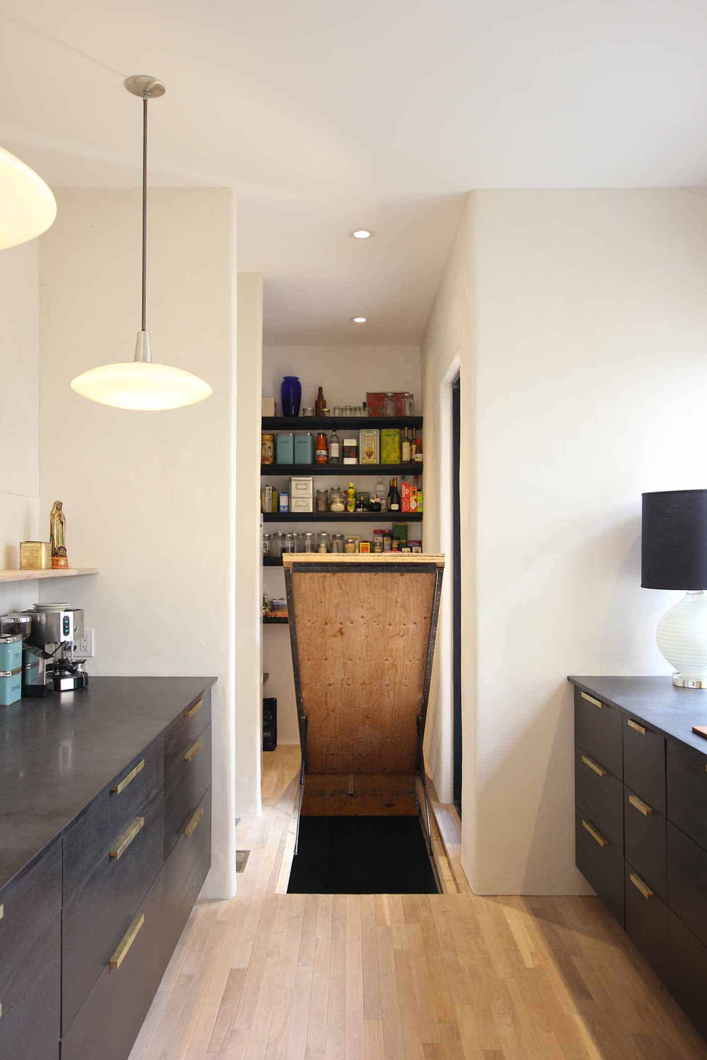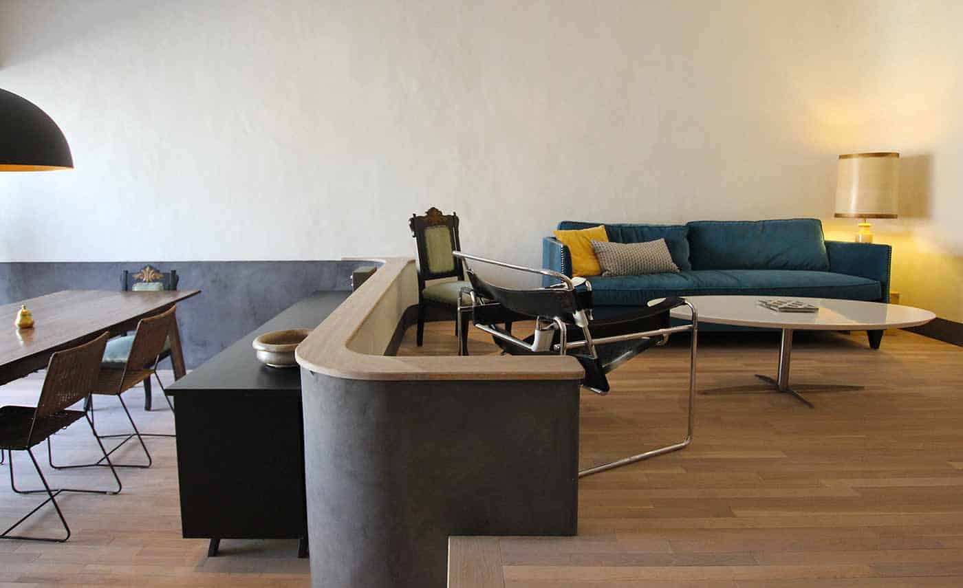 Le design choisi par les propriétaires est un concept à l’européenne avec murs enduits à la chaux, évoquant une jolie maison de vacances en Espagne. On y retrouve notamment plusieurs espaces de rangement visibles, tels que des garde-mangers ouverts, une hotte moulée au mur de la cuisine, ainsi que des murets arrondis, sans arêtes droites, qui délimitent l’espace – une touche certainement originale, mais dont la finition était d’une grande complexité.