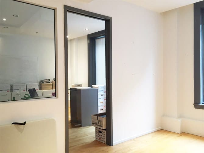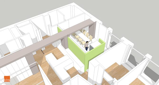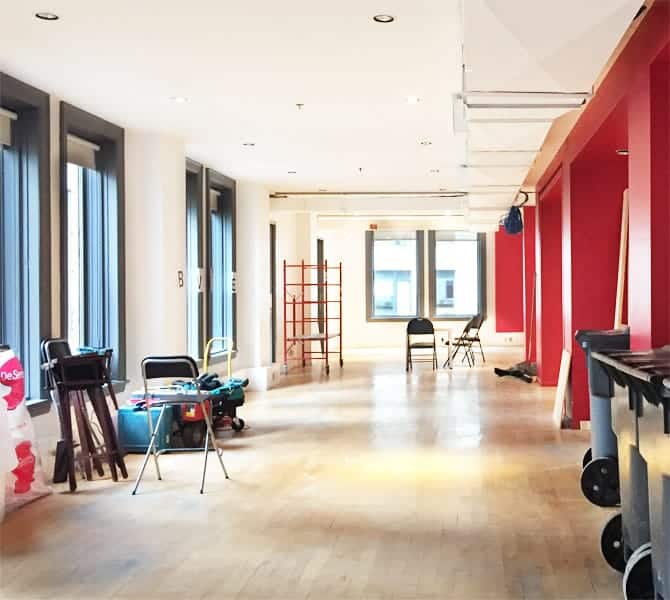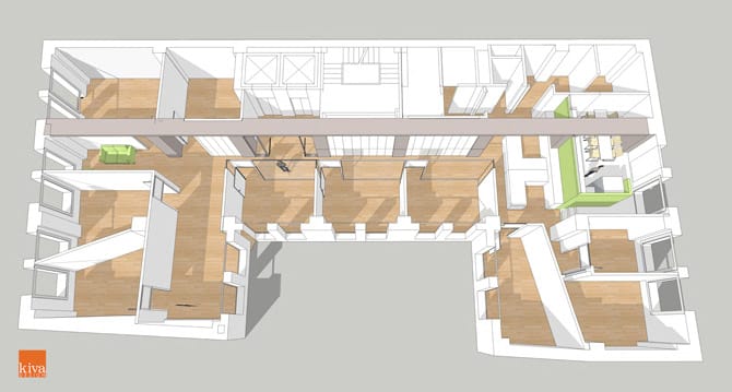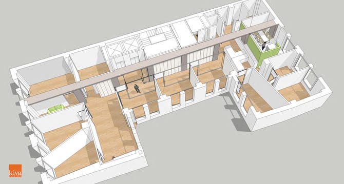 En collaboration avec Kiva Design, A+ s’est vu confier le mandat de construire les nouveaux bureaux des avocats de chez Chenette dans un immeuble de la rue Saint-Jacques, dans le Vieux-Montréal. Comme c’est souvent le cas pour des bureaux d’avocats, ce nouvel aménagement conservera une majorité de bureaux fermés. Nous allons démolir les divisions actuelles et refaire la configuration de l’espace. Une cuisine sera installée et plusieurs bureaux à parois vitrées permettront une meilleure infiltration de la lumière dans l’espace. Les toilettes seront également entièrement refaites. Kiva Design nous a fourni plusieurs visuels pour illustrer le projet :