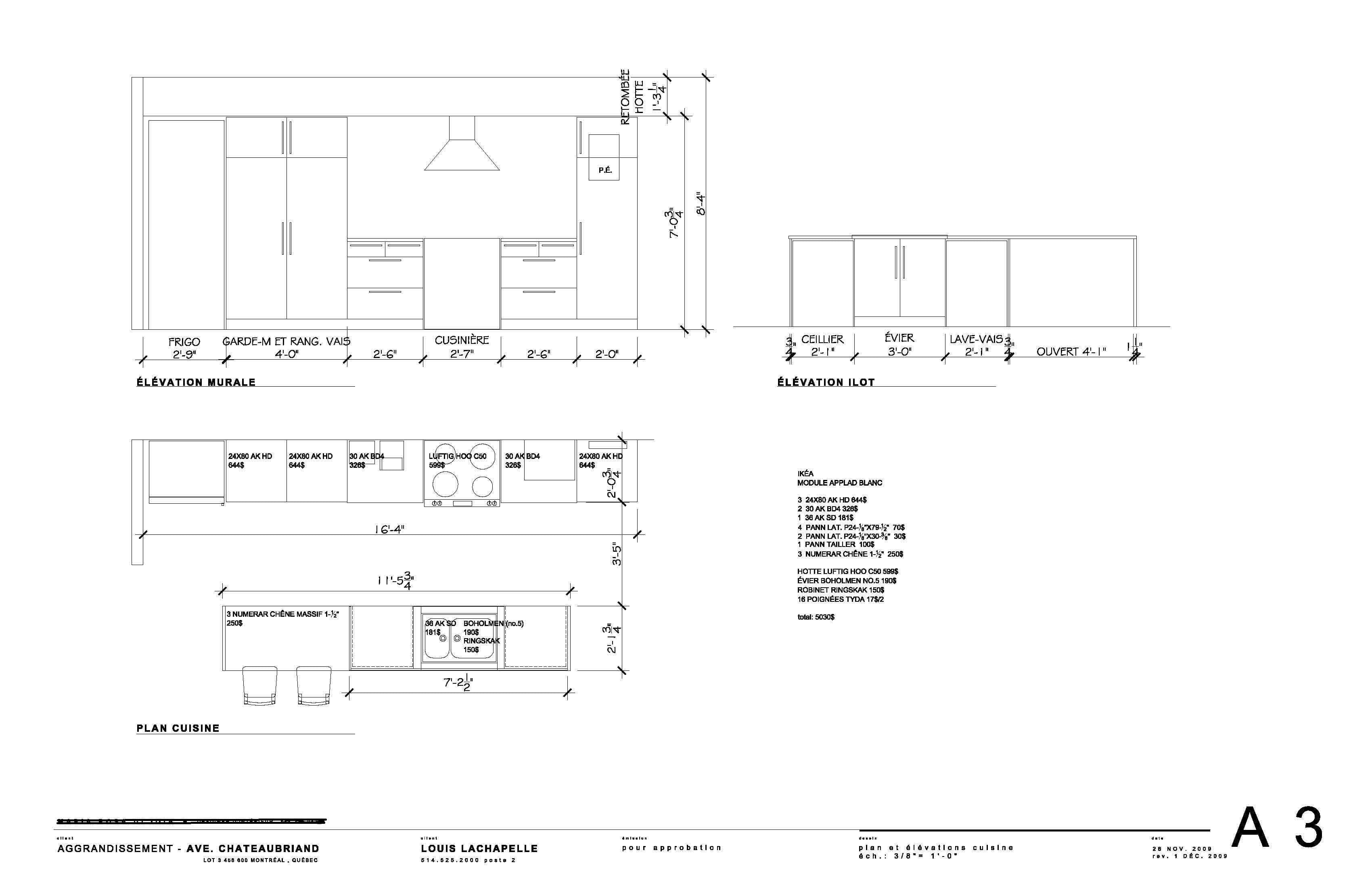 Dans l’ensemble, et bien que ce projet de rénovation de cuisine a fait partie d’un projet de rénovation générale, la rénovation de cuisine se sera échelonnée sur 4 semaines. Les travaux de démolition de la cuisine à rénover et les ajustements mécaniques, électriques et de ventilation auront pris approximativement 1 semaine. Les travaux de construction et de mise en place de la charpente requise pour les travaux auront quant à eux requis 2-3 jours. La construction des planchers de bois franc s’est échelonnée sur 2 jours venant ainsi conclure la deuxième semaine de travaux. La troisième semaine aura été utilisée à la construction et à la mise en place des caissons du mobilier de cuisine ainsi qu’à la fabrication et à l’installation des comptoirs de bois. Finalement, la dernière semaine en aura été une de travaux de finition: le vernissage des comptoirs, les travaux de tirage de joint et de peinture ainsi que bon nombre d’ajustements et de correctifs requis pour livrer le projet final.