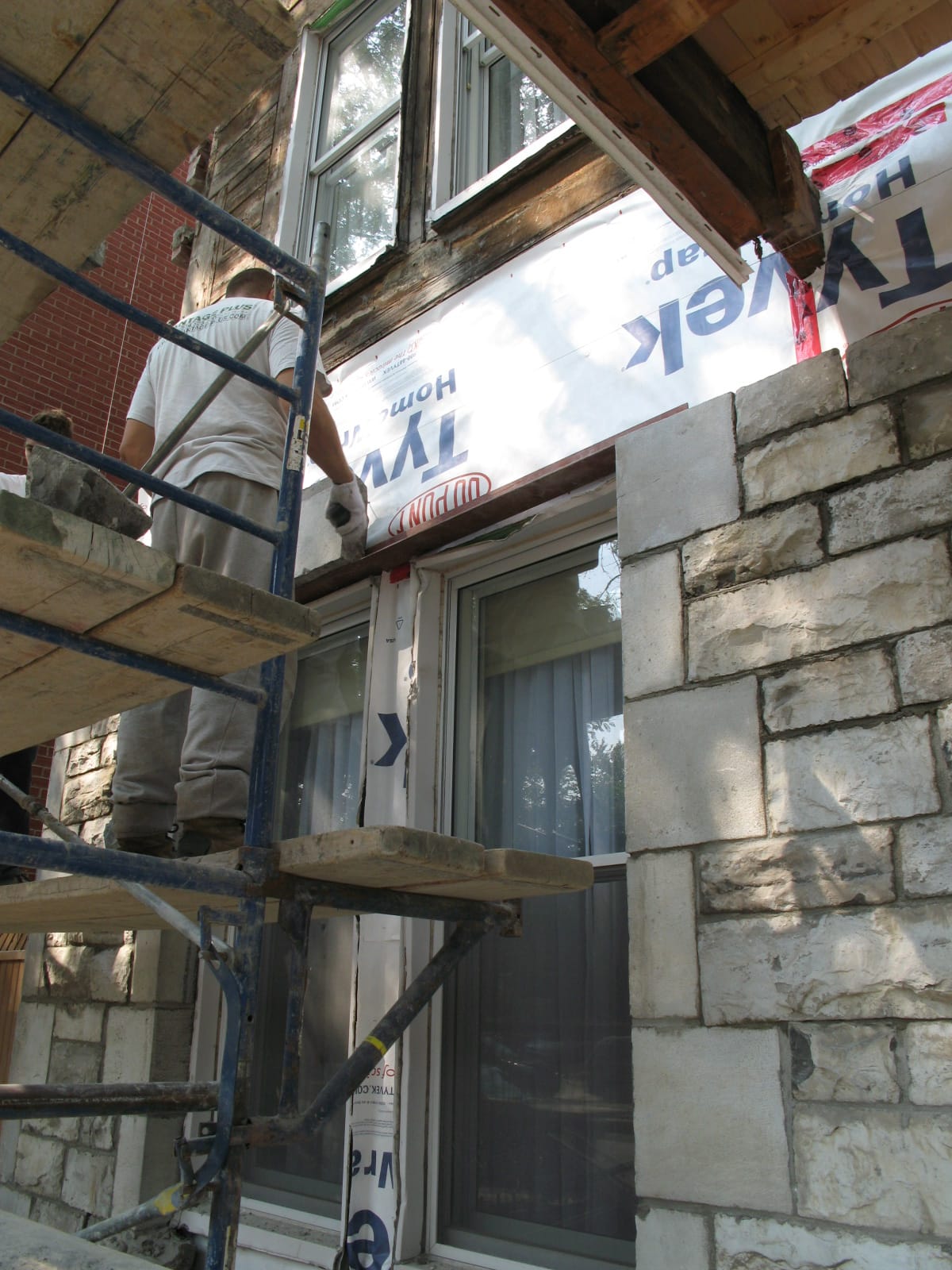 Le fait que la brique et la pierre soient peinturées est l’une des principales causes des nombreuses problématiques en maçonnerie. La pierre naturelle, tout comme la brique, les blocs de maçonnerie, le béton et tout autre produit dérivé du ciment et du sable sont tous poreux. Cette porosité permet à l’humidité de circuler librement au travers les murs de maçonnerie, ce qui est en soit très correct. Bien qu’invisible de l’extérieur, tous les revêtements de maçonnerie comprennent un jeu d’air qui permet une saine ventilation des murs de maçonnerie. La présence d’une barrière isolante pare-vapeur (visible lors de projets de construction et mieux connue sous le nom des produits // TYPAR et TYVEK…) posée sur la charpente des immeubles (ou sur l’isolant extérieur) permet quant à elle d’empêcher la circulation d’humidité entre l’extérieur et l’intérieur des bâtiments. De cette façon, le jeu d’air présent à l’arrière des revêtements de maçonnerie (et de tout autre revêtement) conserve la température de l’entre-mur égale à la température extérieure et empêche ainsi toute condensation entre le revêtement et la charpente murale de l’immeuble.