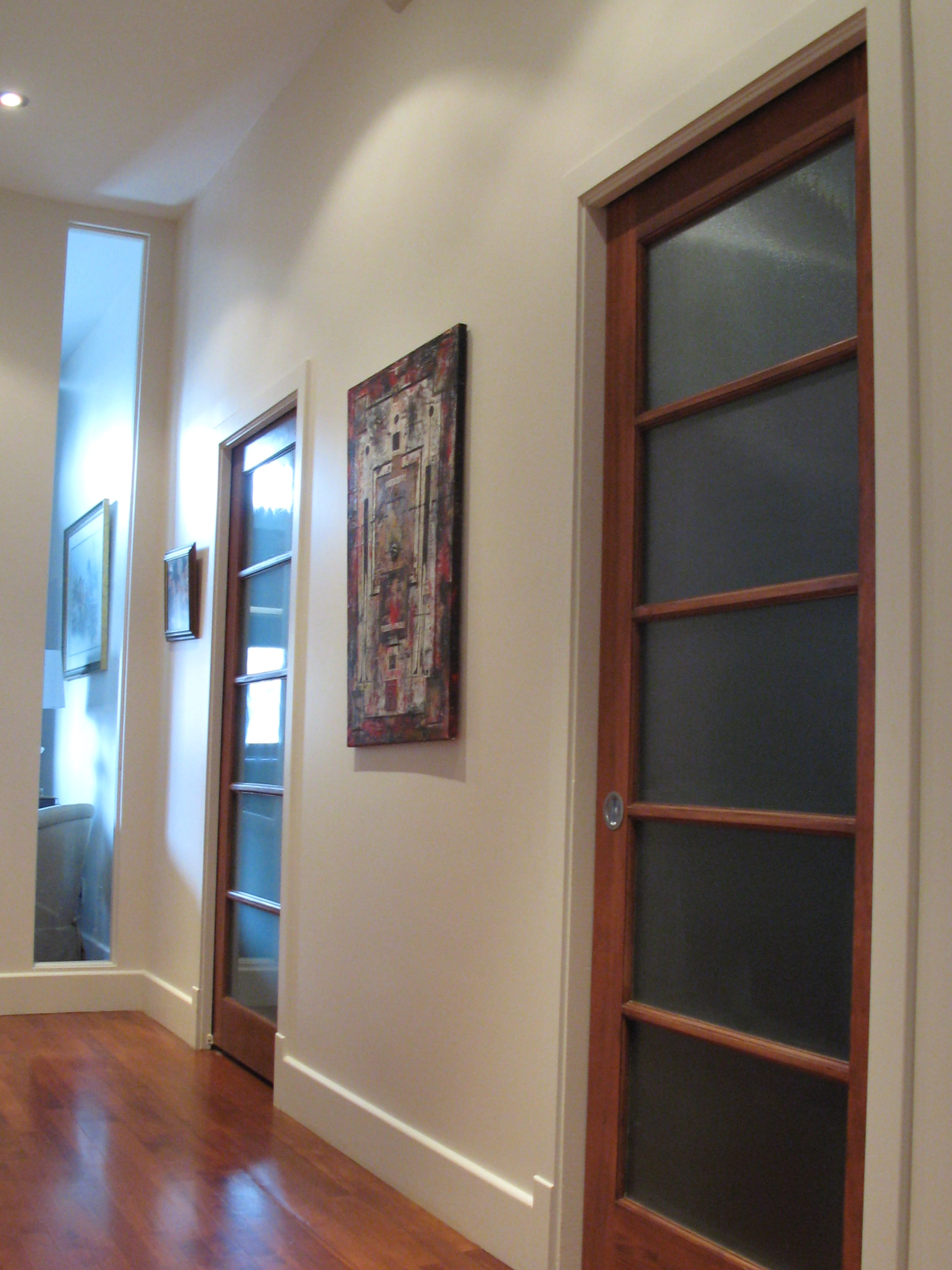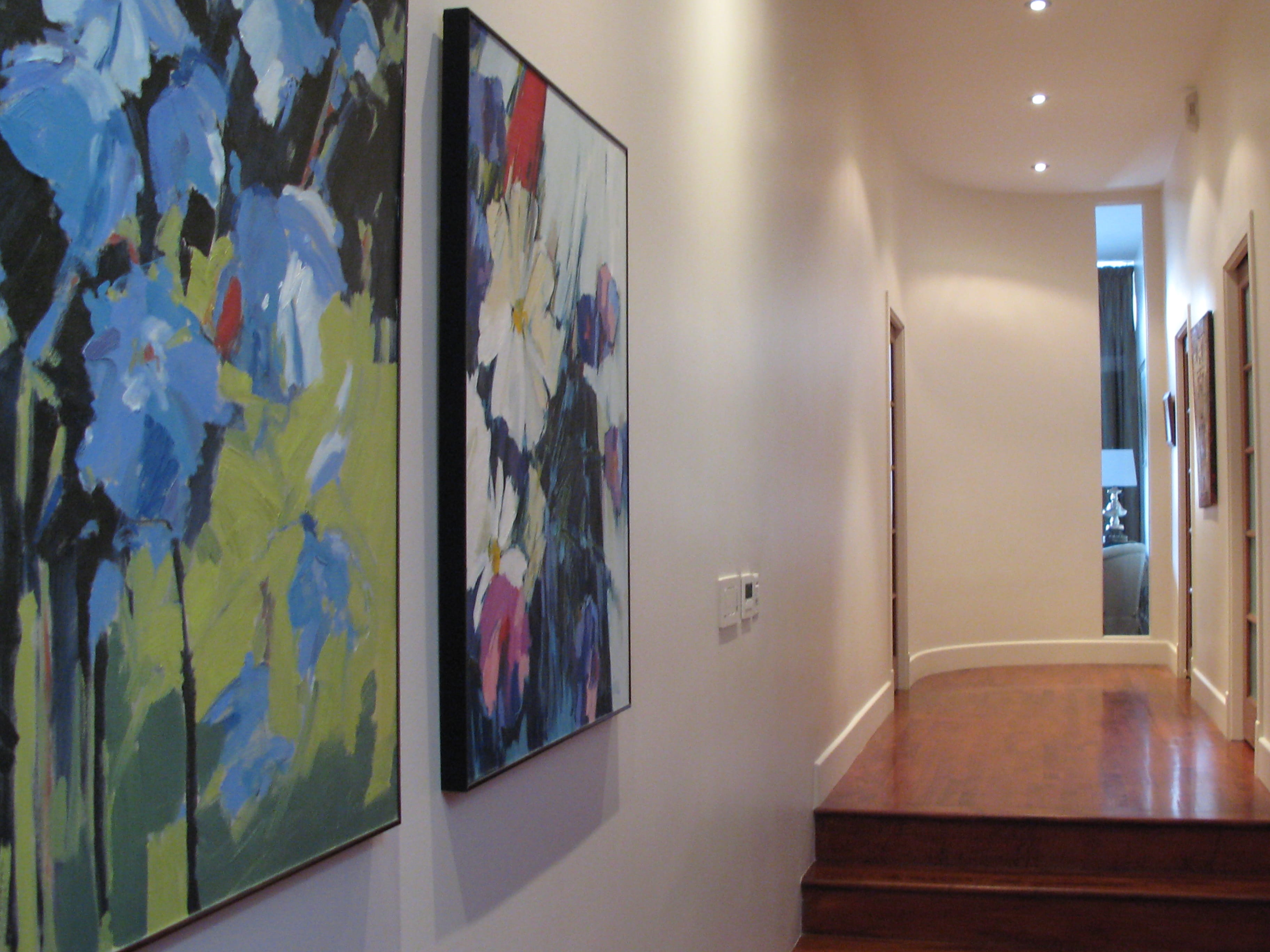 Pour maximiser l’éclairage général du condo, nous avons ajouté une quantité importante de lumières encastrées. Comme dans pratiquement tout réaménagement, le choix de multiplier les lumières encastrées permet de pouvoir utiliser une intensité moins grande tout en bénéficiant d’un éclairage approprié. Le choix d’aménager un mur courbe à l’extrémité du couloir du rez-de-chaussée aura quant à lui été basé sur le désir de garder une perception d’ouverture et de grandeur à l’extrémité des chambres. Le fait d’y avoir aussi aménagé une vitre pleine hauteur permettant à la lumière de la chambre des maîtres va dans le même sens. Remarquez finalement l’absence de couleur au niveau mural qui a pour effet de laisser toute la place aux matières. Le plancher de bois est mis en valeur et contraste grandement avec les murs blancs. Il en est de même pour les portes et boiseries du condo.