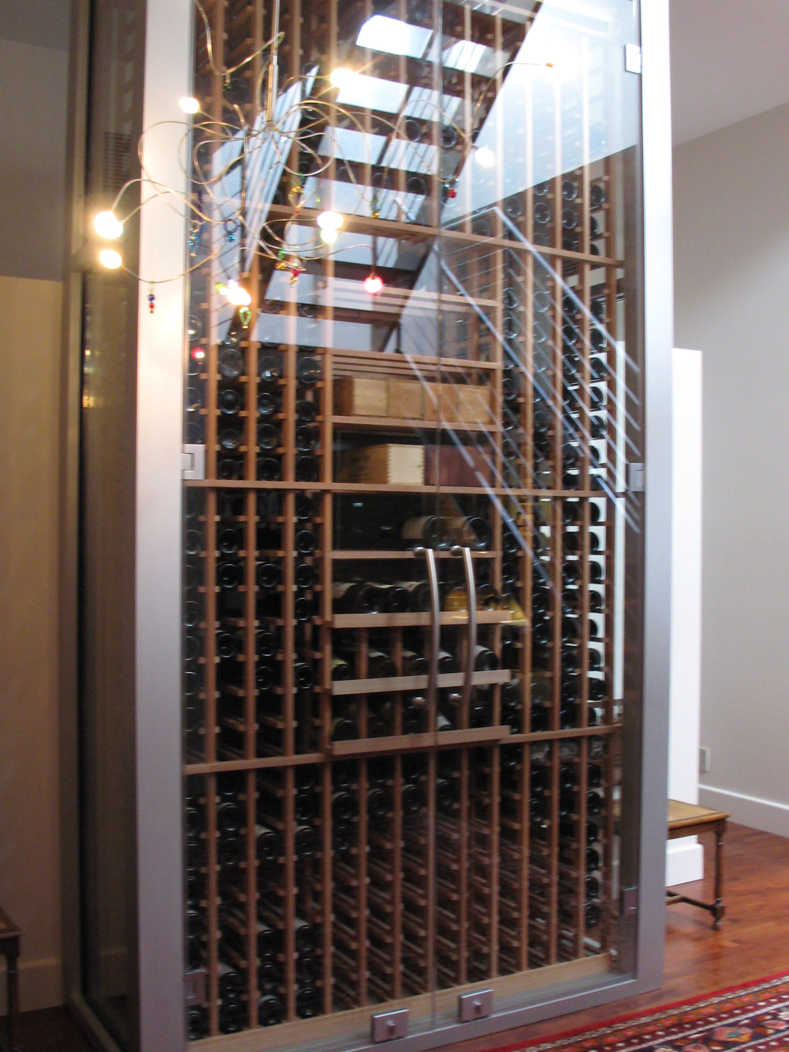 Pour ce projet, nous avons eu la chance de travailler avec de grands espaces. Effectivement, les plafonds de 14′ du rez-de-chaussée ainsi que la grande élévation de la montée d’escalier située au centre du condo sont assez rares. L’aménagement du grand cellier vitré en acier inoxydable se voulait aussi un rappel des limons de la montée d’escalier.