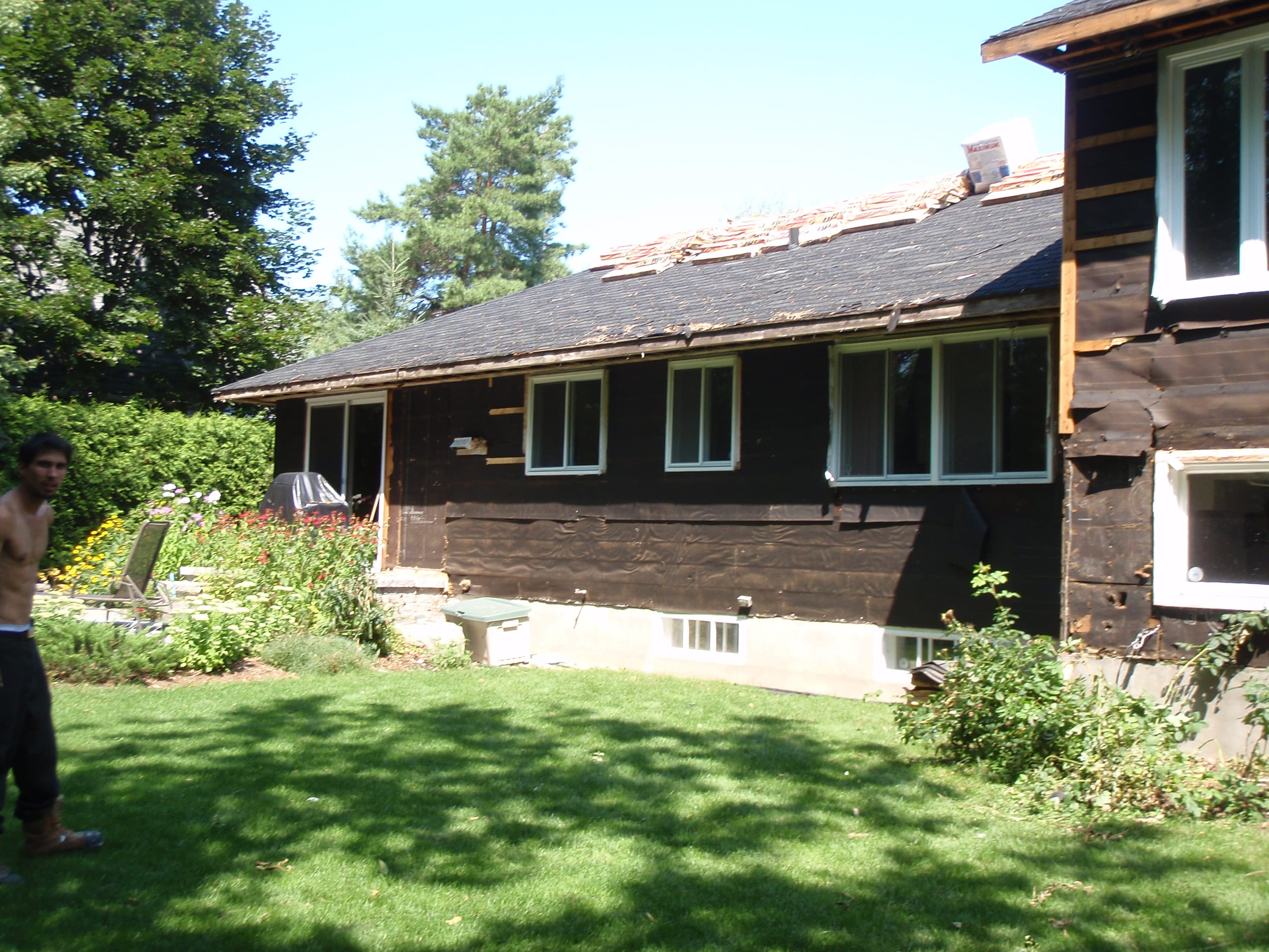 À ce titre, la rénovation de cette maison montréalaise à l’été 2007 a eu comme priorité de remettre l’immeuble aux normes du Code national du bâtiment d’après 2005. Nous avons donc procédé à la démolition complète du revêtement extérieur en vue d’isoler la totalité de la bâtisse. C’est par la pose d’isolant rigide CladeMate 2 » que l’isolation de la maison a été refaite. Le remplacement de toutes les portes et fenêtres de l’immeuble a ensuite suivi. Le choix du brun commercial a été retenu pour la couleur des fenêtres. L’agencement s’est fait tant pour unifier le visuel des élévations avec le nouveau revêtement que pour s’aligner avec la couleur foncée de la nouvelle toiture. Une fois les travaux de toiture réalisés, nous avons pu procéder à la pose de la toiture de bardeaux de couleur brun pâle et à la réalisation des travaux de revêtement extérieur de couleur orange.