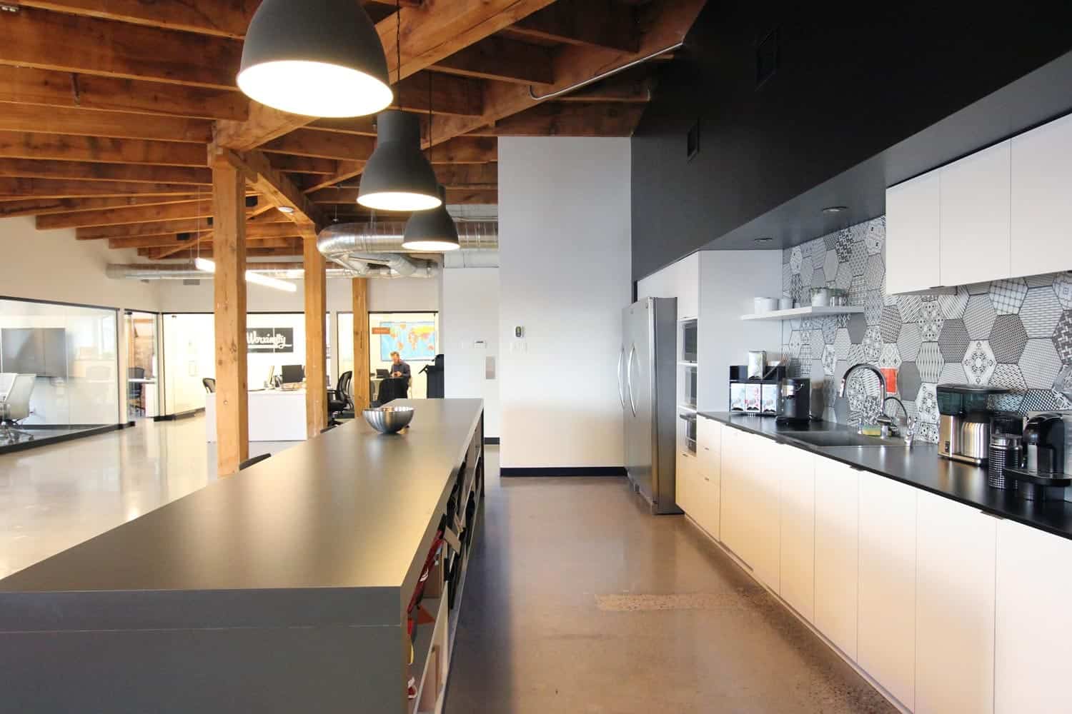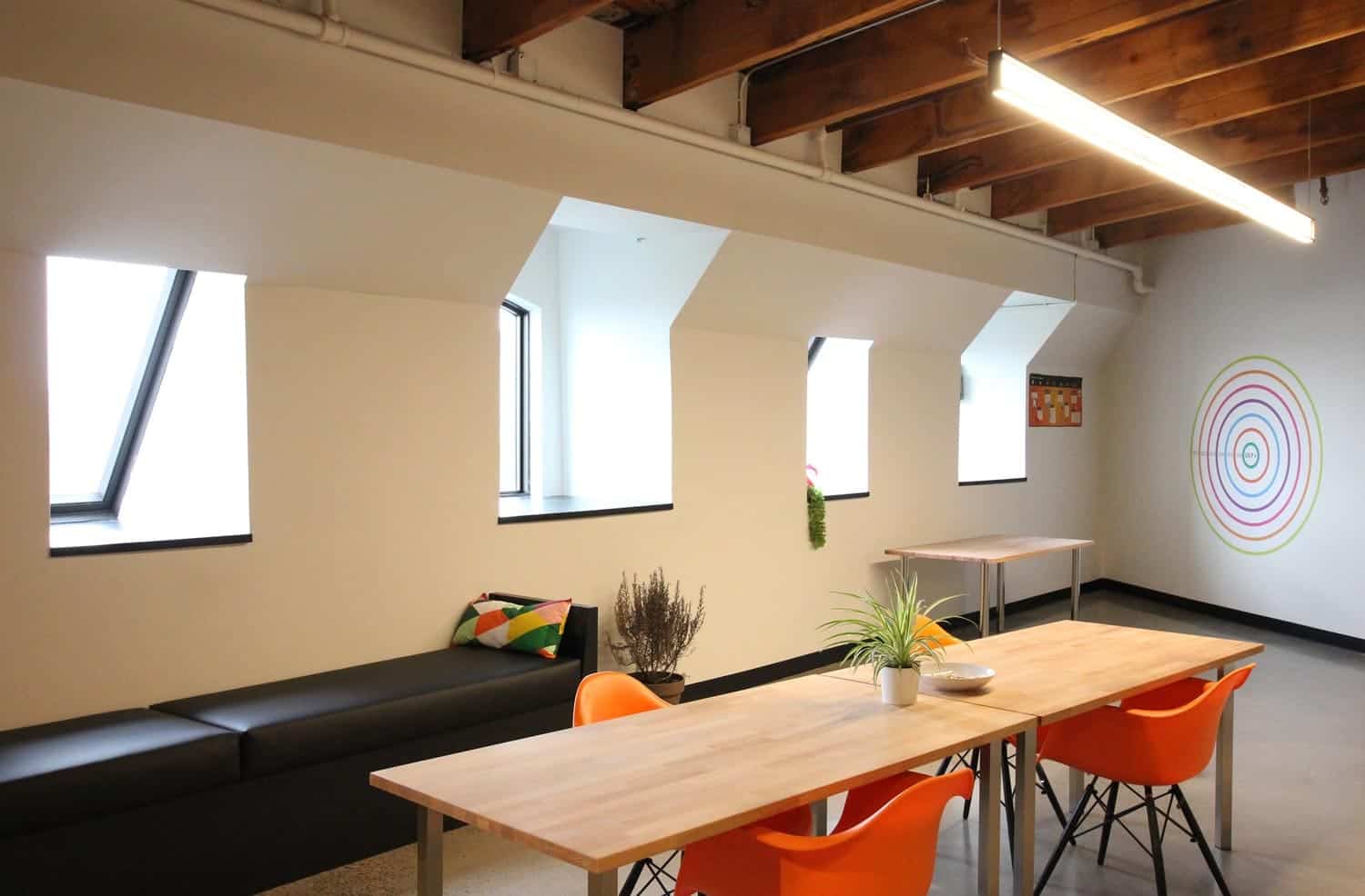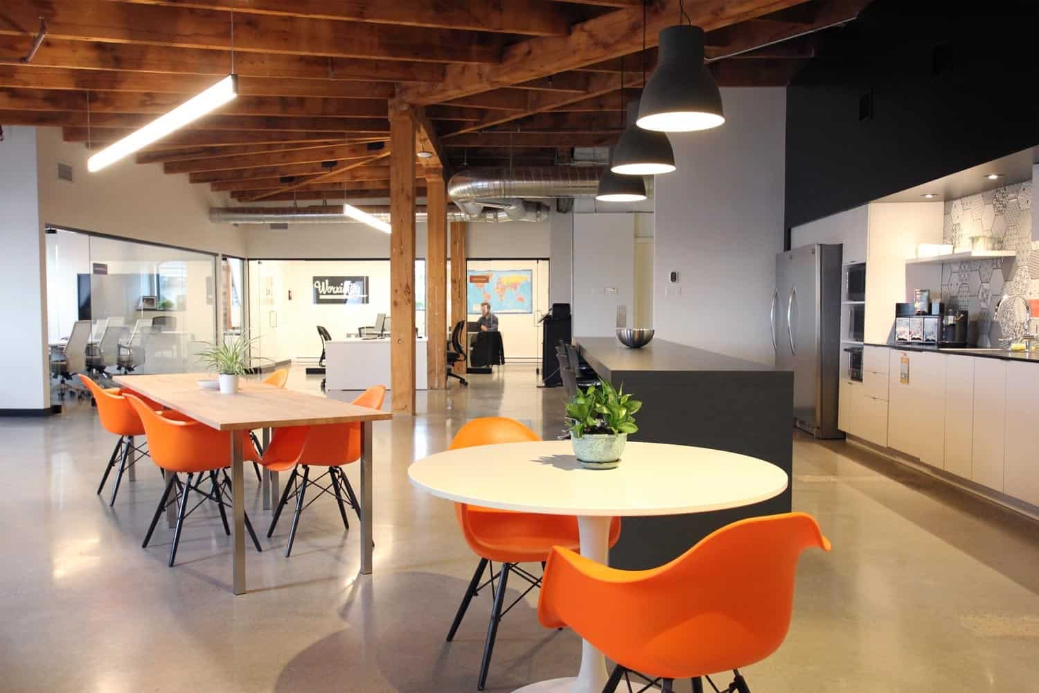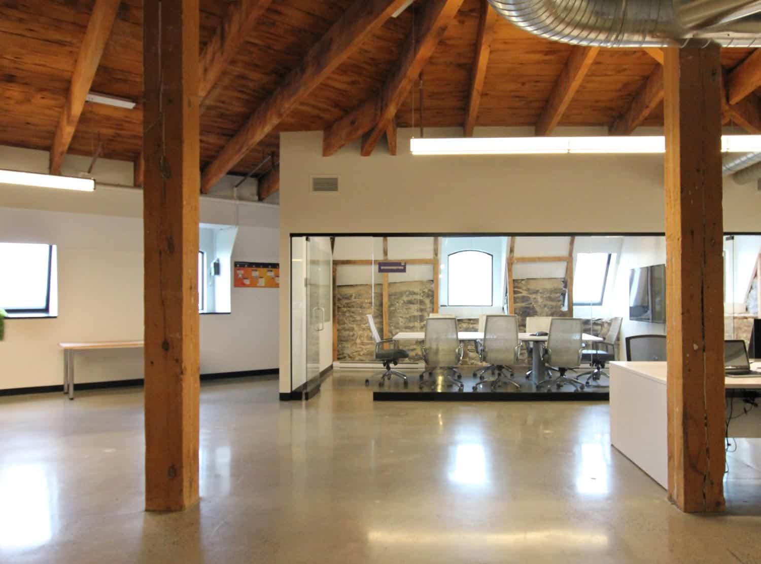 Ce vieux bâtiment au cachet incroyable situé sur la rue de la Commune, dans le Vieux-Montréal, abrite des bureaux de Worximity, une entreprise spécialisée dans les technologies intelligentes. Il s’agit de bureaux spacieux à aire ouverte pourvus de très grandes fenêtres ainsi que d’un plafond d’origine en pruche visible.