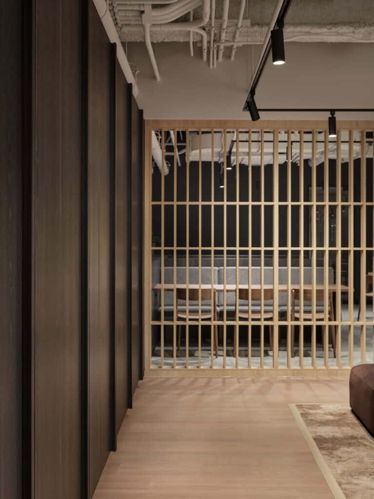 The concept is built on a contemporary interpretation of Japandi: a timeless, understated, calming environment. Simple, low-profile forms; intuitive circulation; a palette of natural materials, wood, granite, touches of charred wood, and warm, diffused, indirect lighting. Textile textures and sheer curtains soften the overall feel and contribute to acoustic comfort. Built-in furnishings are designed as volumes placed within the space, creating a more human, less institutional atmosphere, where greenery integrates organically.