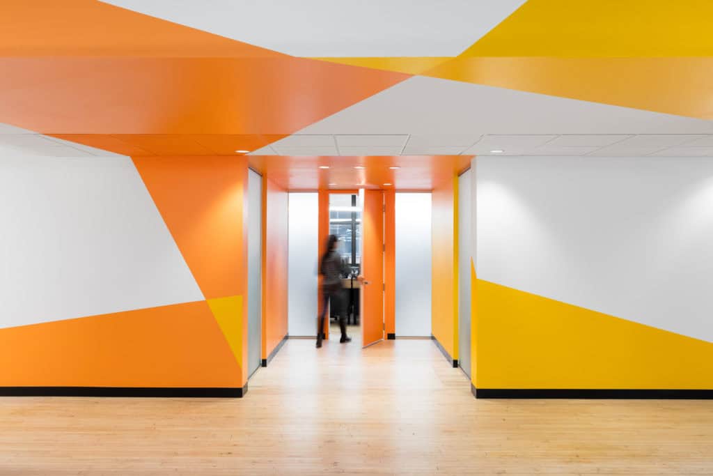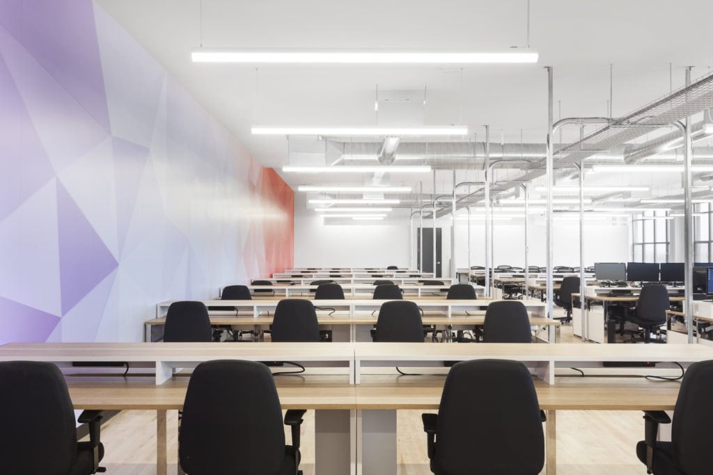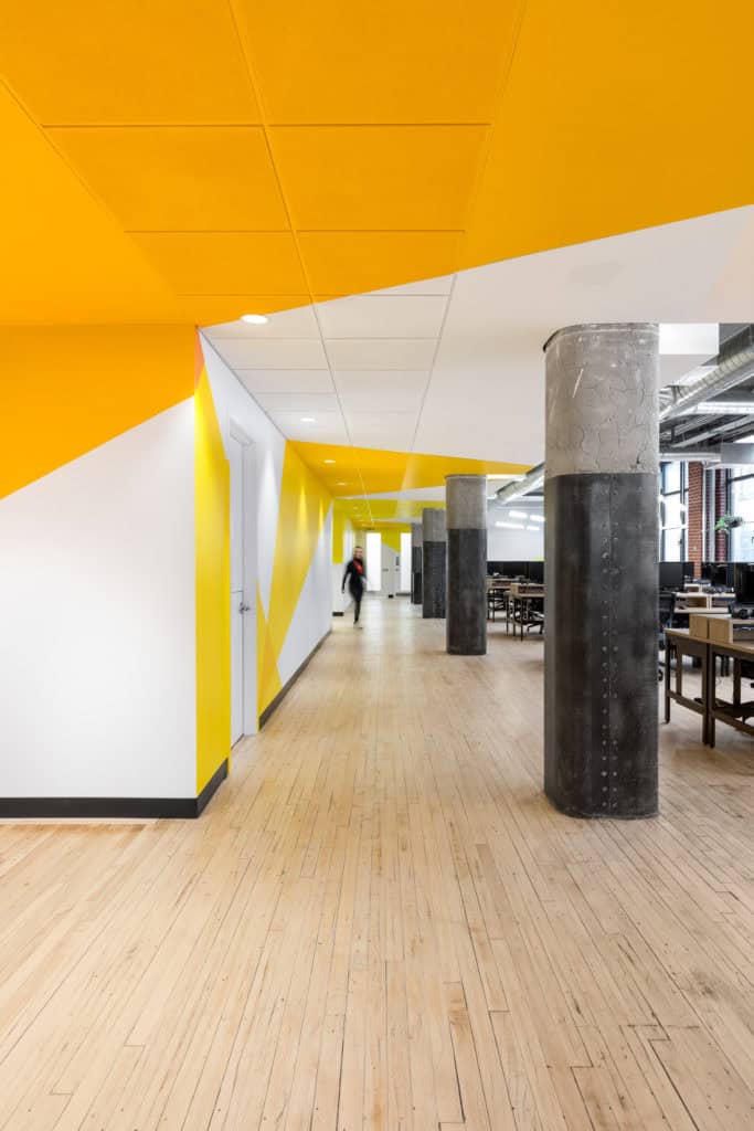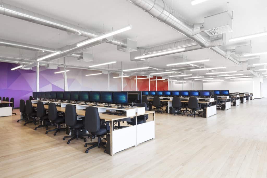 The Keywords Group has over 40 studios on four different continents. At its Montreal studio, 36,000 ft2 had to be added to accommodate about 500 new workstations. An in-depth analysis was required to understand what the company needed for these new workstations. The existing space had an open, double-aspect design. To ensure the security and confidentiality levels required, the suite had to be cut through lengthwise, which affected its intrinsic spaciousness.