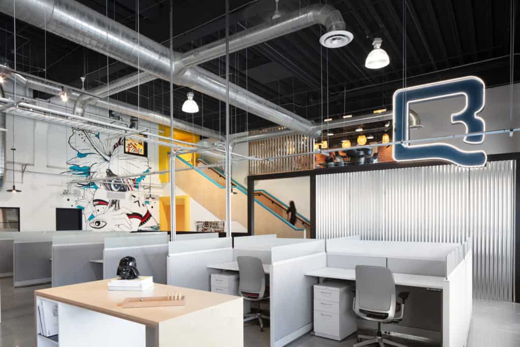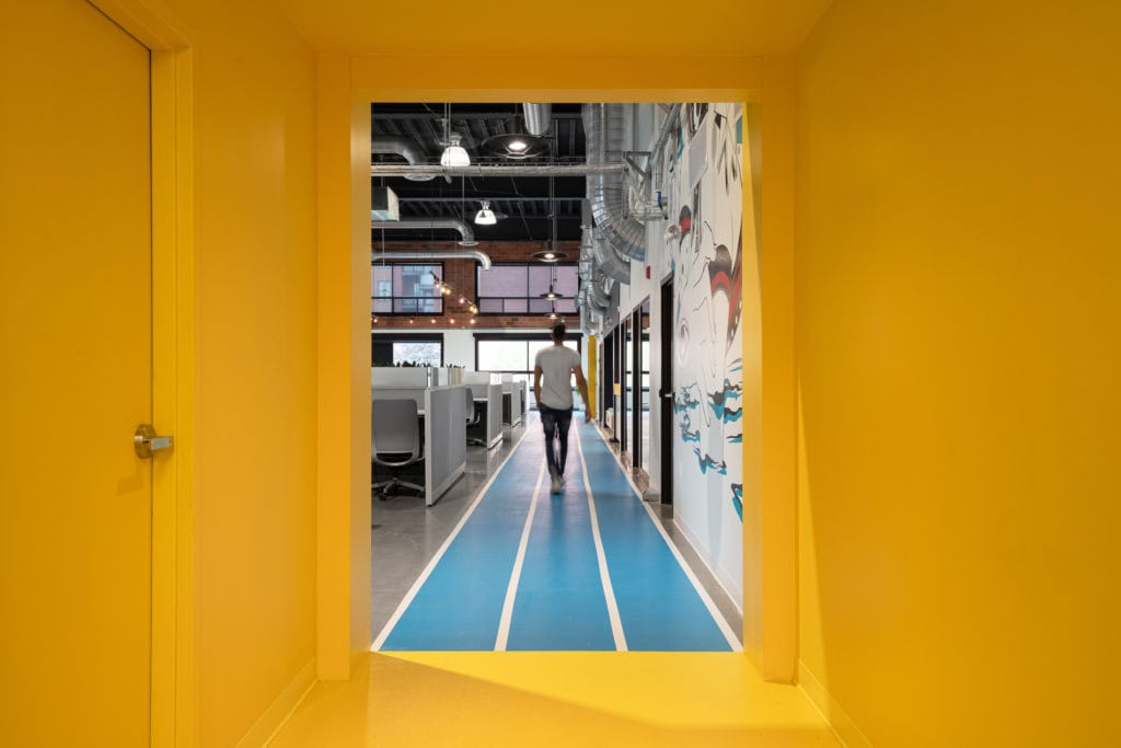 This is the new office space of Quadbridge, a company that assists businesses with their IT support needs. Its new 16,000-square-foot work environment now provides an inspiring hub for the company’s human culture. It has a number of spaces dedicated to well-being, such as a race track, a private gym, a superb cafeteria, a game area and even a brand new outdoor terrace that offers a more enjoyable space for meetings and events with colleagues! This unique, colourful makes employees want to go to the office!