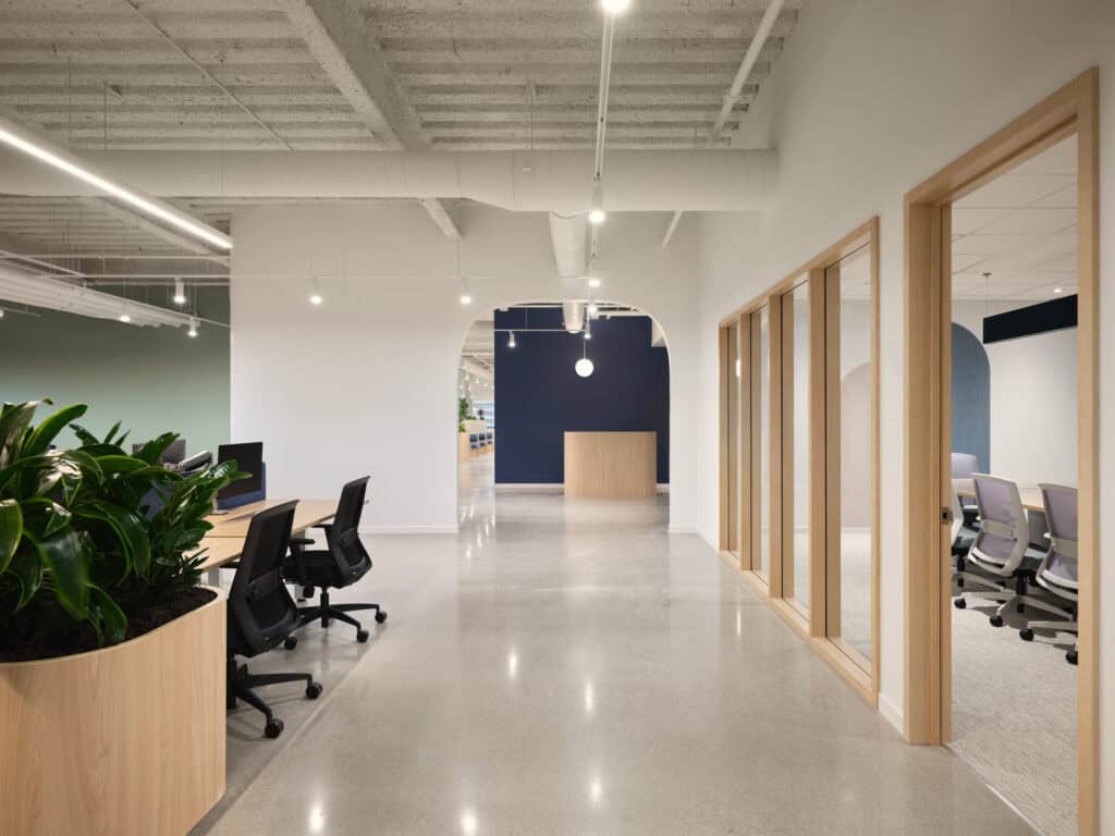Notre concept, c’était de créer un lieu de travail enveloppant, où la rondeur des lignes et la douceur des tons marins se mêlent aux matières chaleureuses du bois et du velours pour offrir un espace à la fois apaisant, vibrant et confortable. La lumière naturelle y est mise en valeur, portée par des teintes fraîches et une matérialité douce, pour une ambiance zen qui reflète les valeurs de l’entreprise. Une attention particulière a été portée à l’acoustique des salles de réunion, grâce à l’intégration de luminaires acoustiques et de panneaux absorbants, afin de favoriser des échanges fluides, concentrés et créatifs.