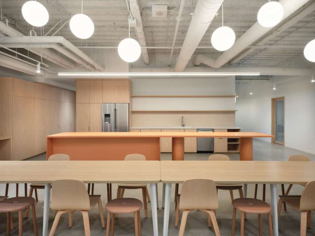 Au cœur du projet, la cafétéria s’impose comme espace signature : audacieuse par ses couleurs et ses formes, mais résolument modeste et rassembleuse. L’îlot orange de forme inusitée devient un point de rencontre informel, tandis que le luminaire de la cuisine agit comme véritable pièce maîtresse. Autour, les banquettes longeant la fenestration offrent des vues privilégiées sur le centre-ville et invitent aux discussions spontanées. Plus en retrait, des salles solo ou duo, confortables et intimistes, permettent de se recentrer ou de tenir des échanges confidentiels. L’ébénisterie occupe une place centrale : cloisons vitrées en bois, meuble de réception, bacs à plantes arrondis et comptoir de cuisine courbe renforcent le caractère humain et chaleureux de l’espace, tout en apportant une dimension biophilique chère à l’entreprise.
