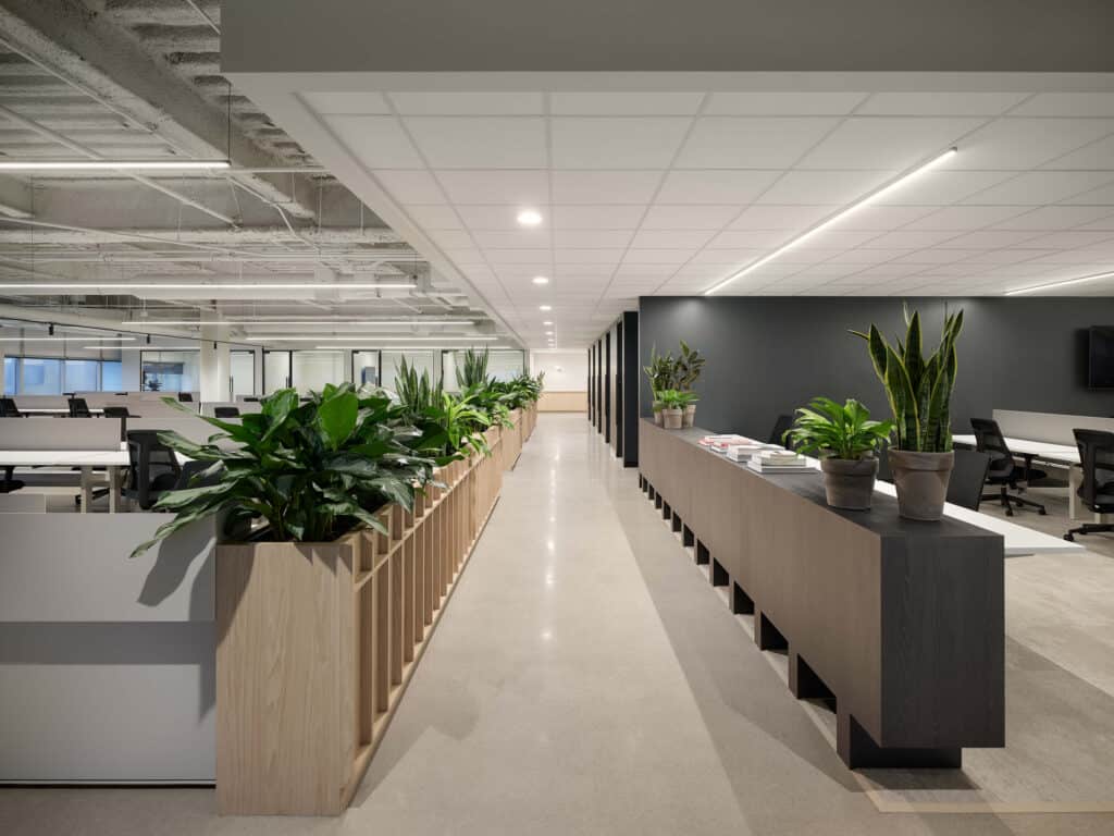 Les moments forts se concentrent autour de l’entrée, cœur du projet, encadrée par des cloisons ajourées qui filtrent les vues et orchestrent une transition douce vers les bureaux ou la cuisine, ainsi que des phone booths intégrés sous une retombée architecturale flottante, repère clair qui structure l’aire ouverte. Un défi majeur a guidé la conception : maîtriser les nuisances sonores, notamment celles des systèmes mécaniques et des zones collaboratives, avec des solutions intégrées et durables.