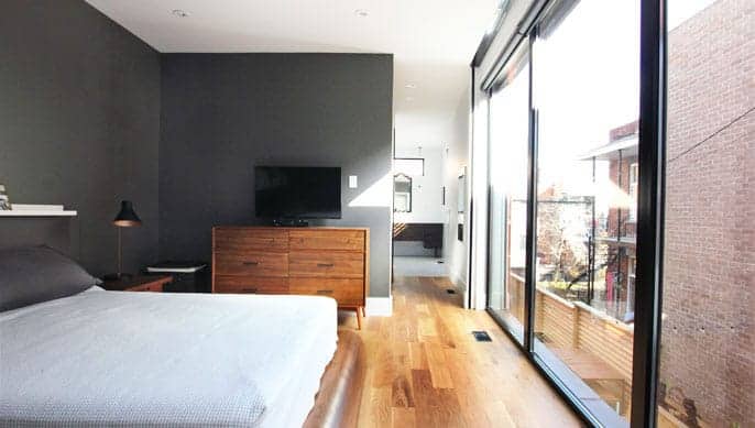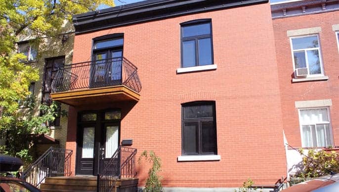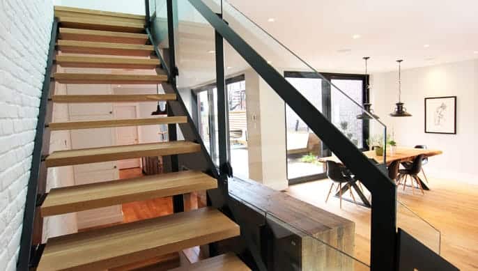 En plus de la nouvelle structure de la maison, nous avons entièrement refait l’électricité et la plomberie et installé une nouvelle ventilation centrale (système domotique pouvant être contrôlé à partir d’un téléphone). La maçonnerie de la façade avant a été entièrement refaite tandis que d’importants murs de verre ont été installés sur la façade arrière : nous avons d’ailleurs dû poser un rideau coupe feu aux immenses vitres afin de respecter les normes en matière de vitrage exposé à un mur mitoyen. Nous avons posé un plancher de bois franc partout sauf au sous-sol qui a été recouvert d’une dalle de béton radiante. Un foyer et une cuisinière au gaz ont également été installés dans la cuisine à aire ouverte. Un escalier en acier aux marches de bois encastrées et entouré d’un garde corps de verre amène à l’étage des chambres. En plus des trois chambres spacieuses (dont l’une est dotée d’un imposant walk-in) qui ont été construites, d’immenses salles de bain ont requis l’installation de tuiles 36 x 36 pouces, véritable défi…de taille !