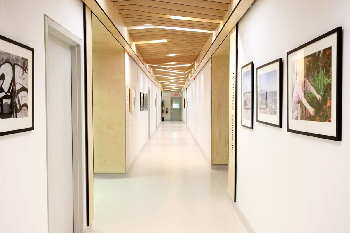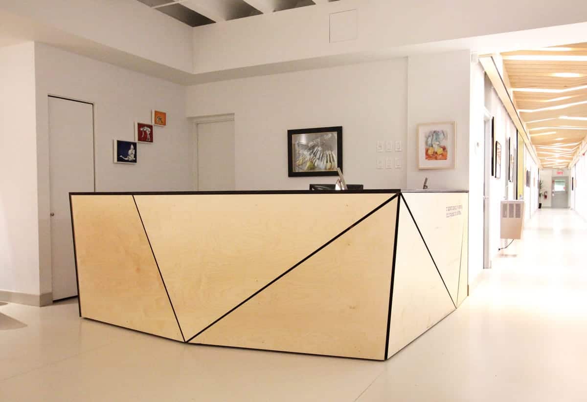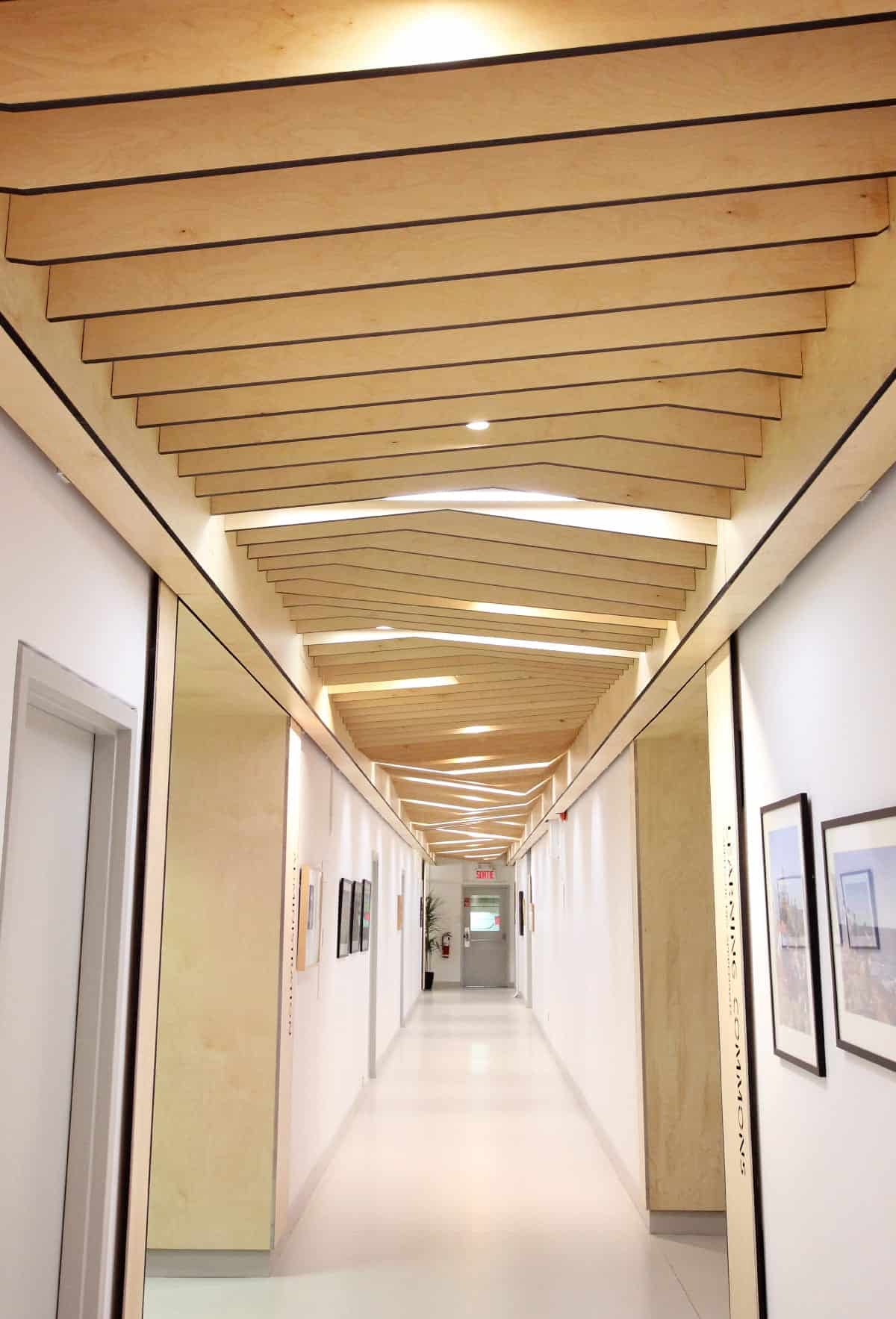 Imaginé par les architectes de l’atelier In Situ, ce projet prévoyait l’installation d’un plafond architectural en plywood russe sur l’ensemble du corridor et la confection de deux bureaux massifs aux formes atypiques. Dans le corridor, l’éclairage camouflé entre les planches laisse filtrer une lumière douce et naturelle. Les lieux sont désormais plus modernes et chaleureux. Ce projet a dû être réalisé dans un délai de 6 semaines, en dehors des heures de cours et a requis un travail d’ébénisterie précis. Pour plus d’informations sur ce projet, c’est par ici.