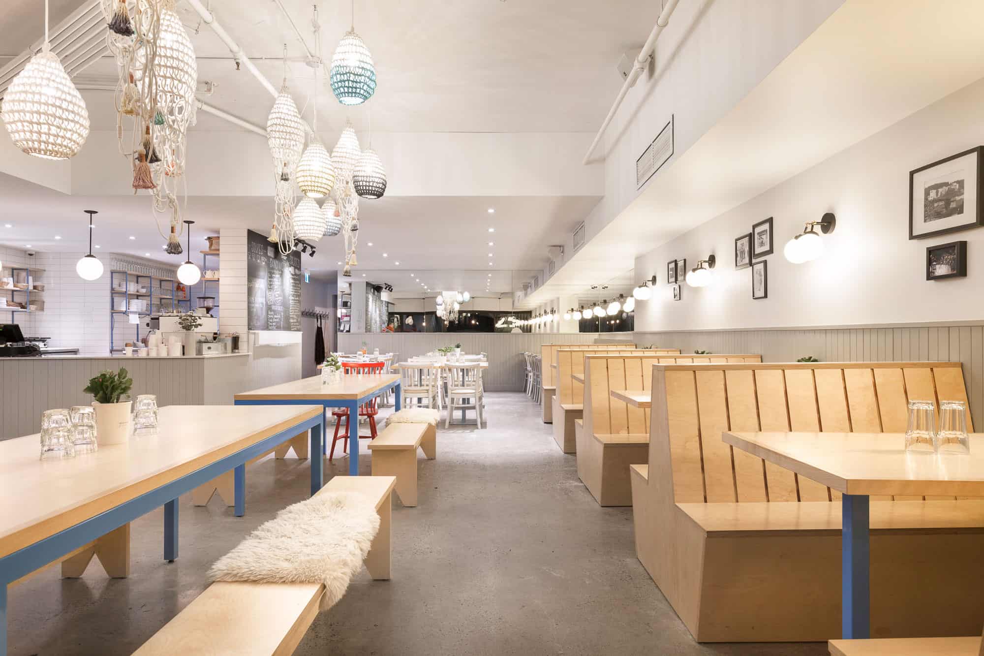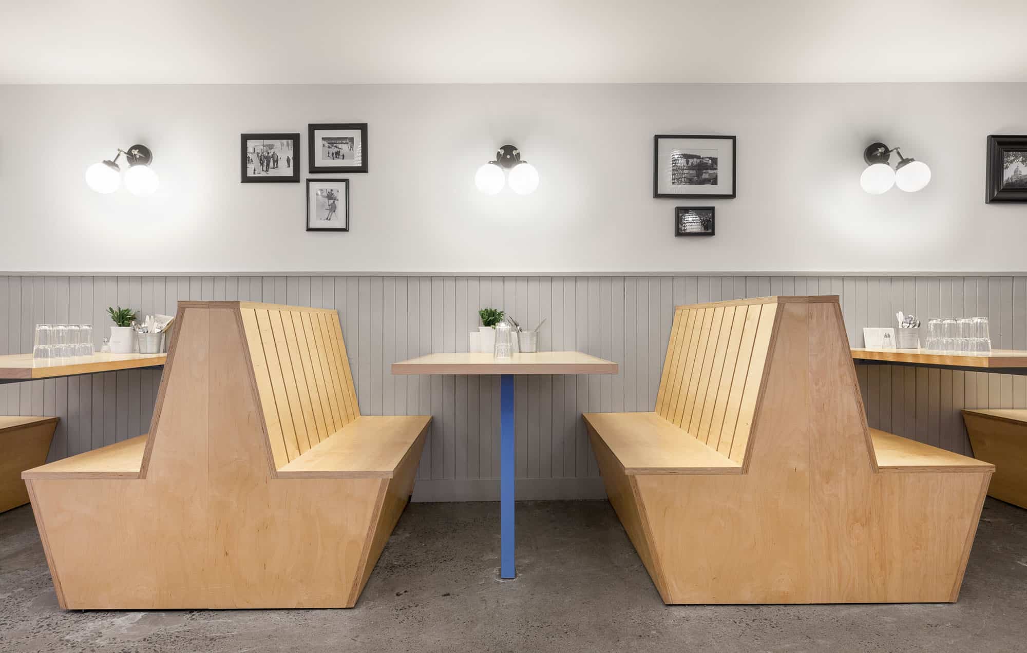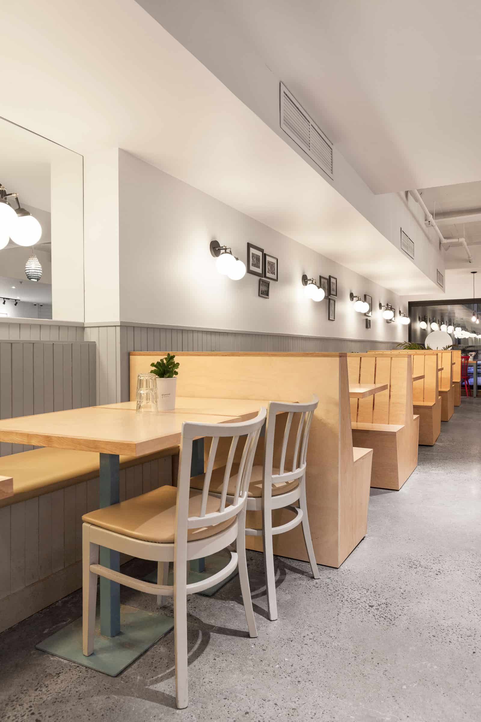 Une grande façade vitrée laisse entrer la lumière dans ce local d’un peu plus de 2000 pieds carrés. À droite, de nombreuses banquettes en bois fabriquées sur mesure sont alignées le long du mur, créant des espaces repas intimes. À gauche, un immense comptoir en marbre placé en diagonale et surplombé de luminaires délimite l’espace de travail des employés. Tous les murs de la salle sont recouverts d’un lambris de bois. À l’arrière, une cuisine respectant les normes de salubrité HACCP et des salles de bain neuves ont été construites. La dalle de béton au sol a été entièrement polie et du béton a été coulé pour restaurer les pentes de l’entrée du restaurant.