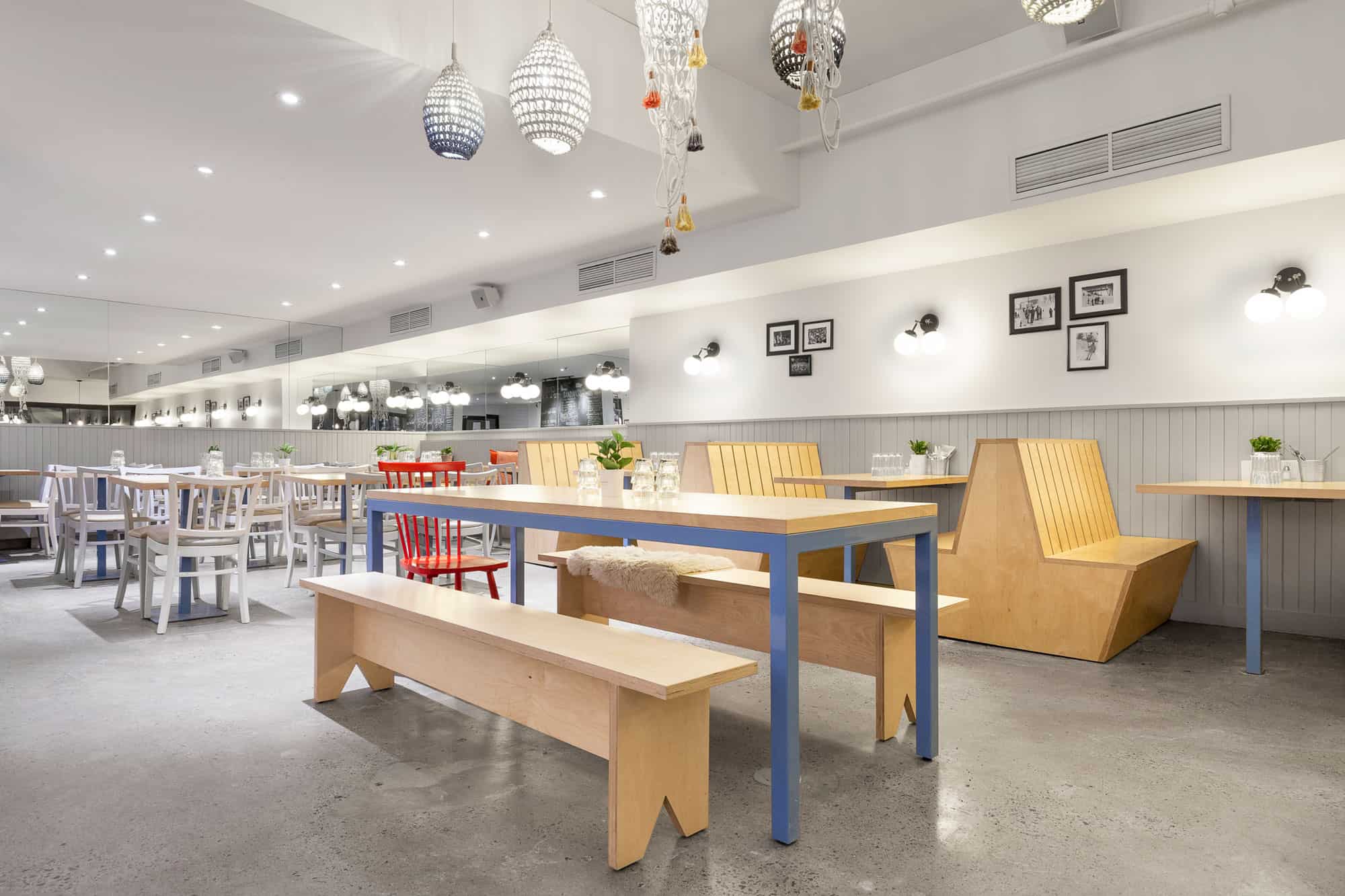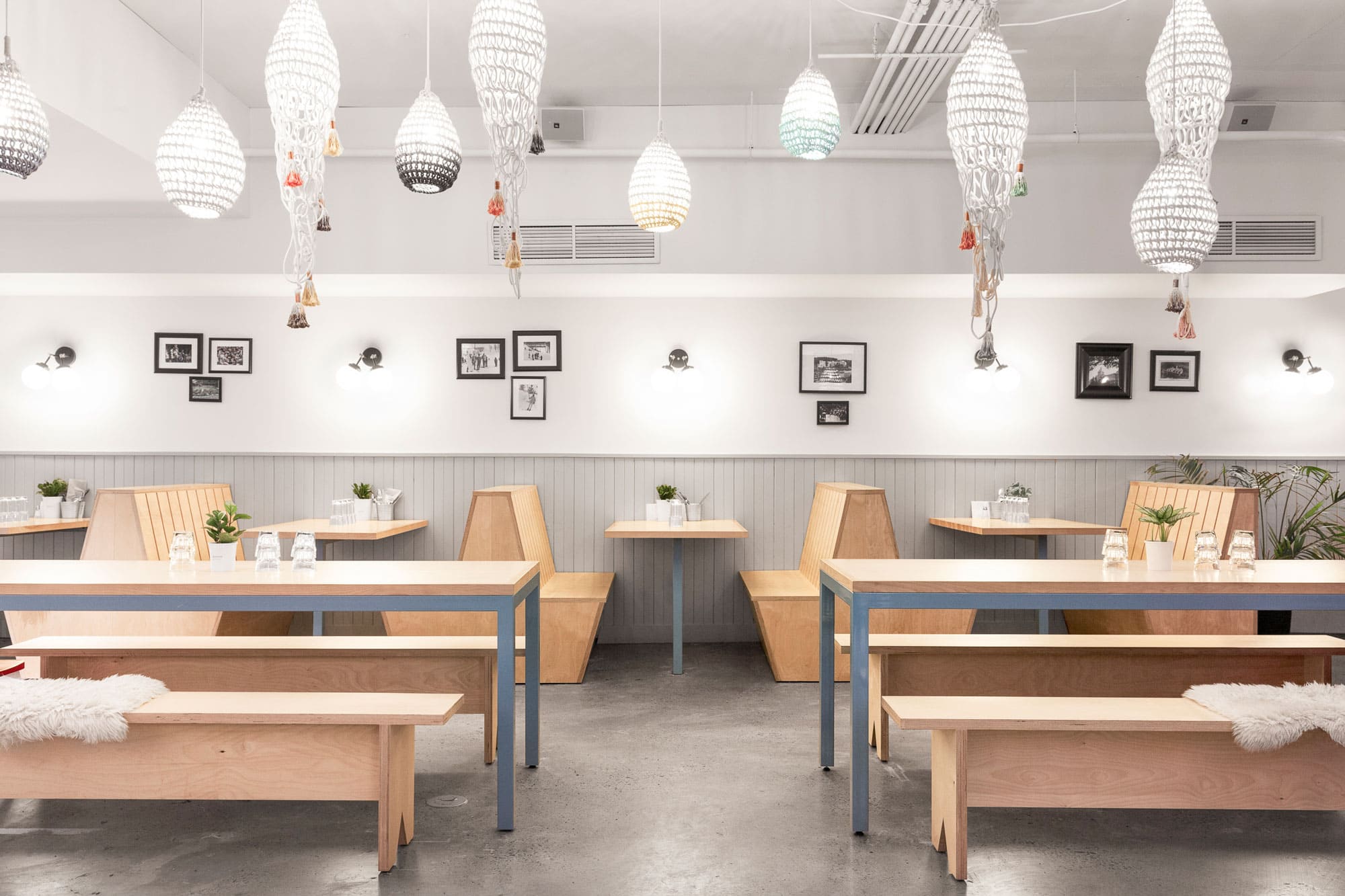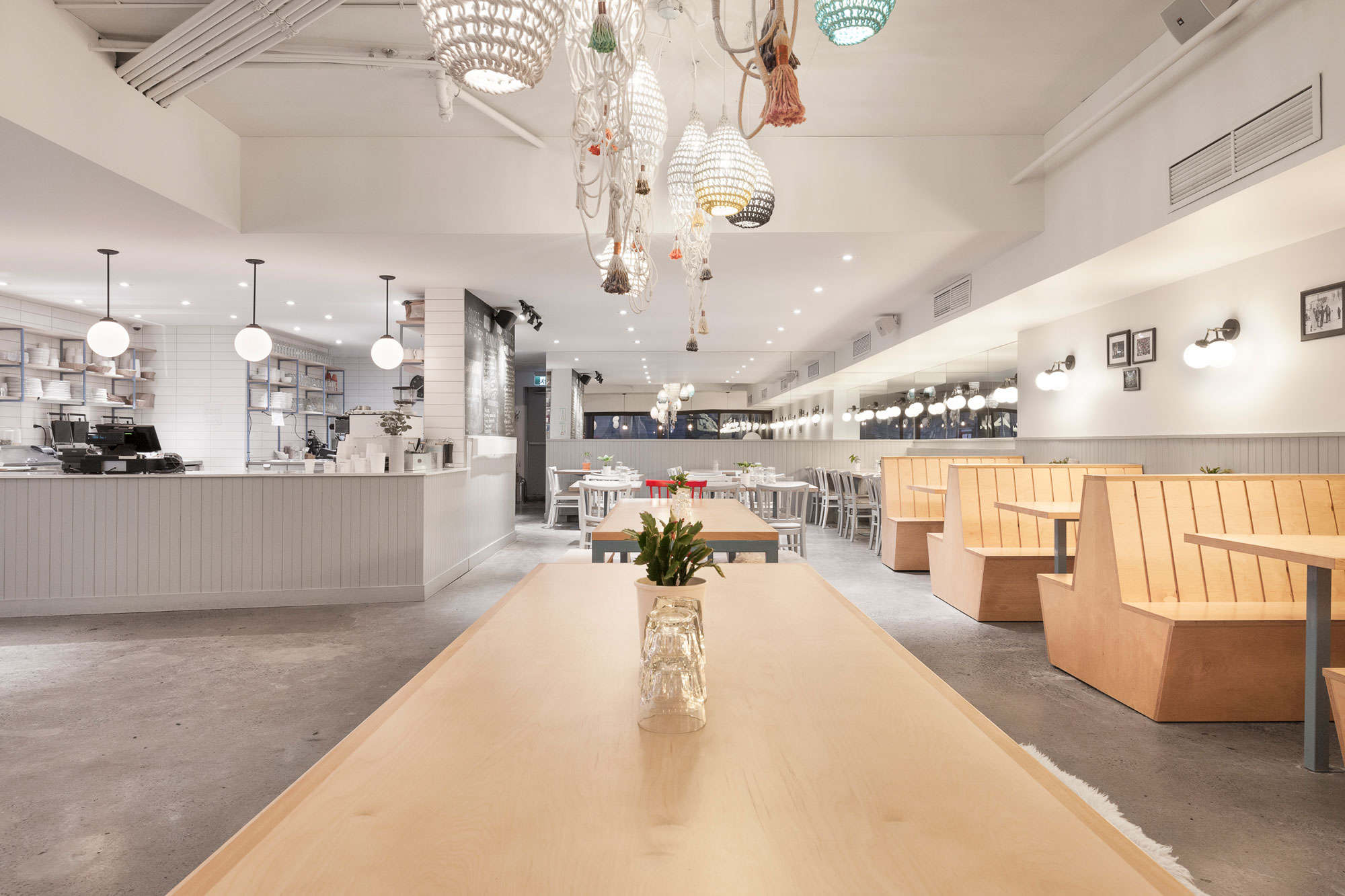 Une grande façade vitrée laisse entrer la lumière dans ce local d’un peu plus de 2000 pieds carrés. À droite, de nombreuses banquettes en bois fabriquées sur mesure sont alignées le long du mur, créant des espaces repas intimes. À gauche, un immense comptoir en marbre placé en diagonale et surplombé de luminaires délimite l’espace de travail des employés. Tous les murs de la salle sont recouverts d’un lambris de bois. À l’arrière, une cuisine respectant les normes de salubrité HACCP et des salles de bain neuves ont été construites. La dalle de béton au sol a été entièrement polie et du béton a été coulé pour restaurer les pentes de l’entrée du restaurant.