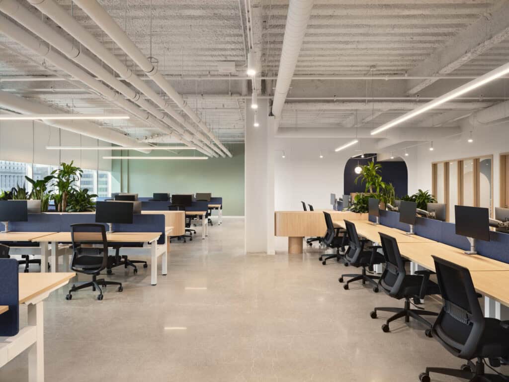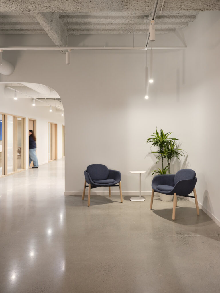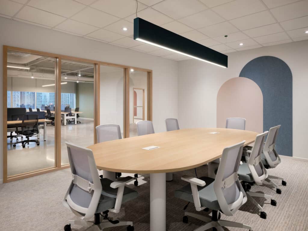 Notre concept, c’était de créer un lieu de travail enveloppant, où la rondeur des lignes et la douceur des tons marins se mêlent aux matières chaleureuses du bois et du velours pour offrir un espace à la fois apaisant, vibrant et confortable. La lumière naturelle y est mise en valeur, portée par des teintes fraîches et une matérialité douce, pour une ambiance zen qui reflète les valeurs de l’entreprise. Une attention particulière a été portée à l’acoustique des salles de réunion, grâce à l’intégration de luminaires acoustiques et de panneaux absorbants, afin de favoriser des échanges fluides, concentrés et créatifs.