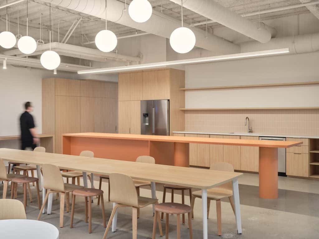 Au cœur du projet, la cafétéria s’impose comme espace signature : audacieuse par ses couleurs et ses formes, mais résolument modeste et rassembleuse. L’îlot orange de forme inusitée devient un point de rencontre informel, tandis que le luminaire de la cuisine agit comme véritable pièce maîtresse. Autour, les banquettes longeant la fenestration offrent des vues privilégiées sur le centre-ville et invitent aux discussions spontanées. Plus en retrait, des salles solo ou duo, confortables et intimistes, permettent de se recentrer ou de tenir des échanges confidentiels. L’ébénisterie occupe une place centrale : cloisons vitrées en bois, meuble de réception, bacs à plantes arrondis et comptoir de cuisine courbe renforcent le caractère humain et chaleureux de l’espace, tout en apportant une dimension biophilique chère à l’entreprise.