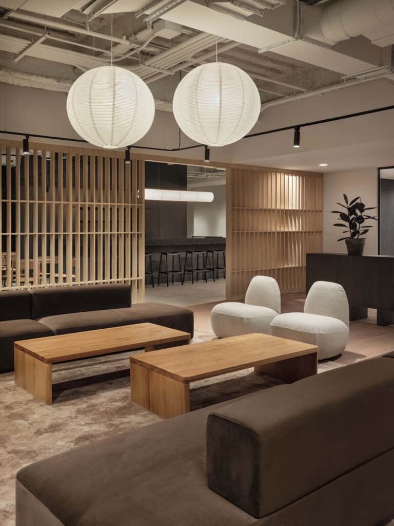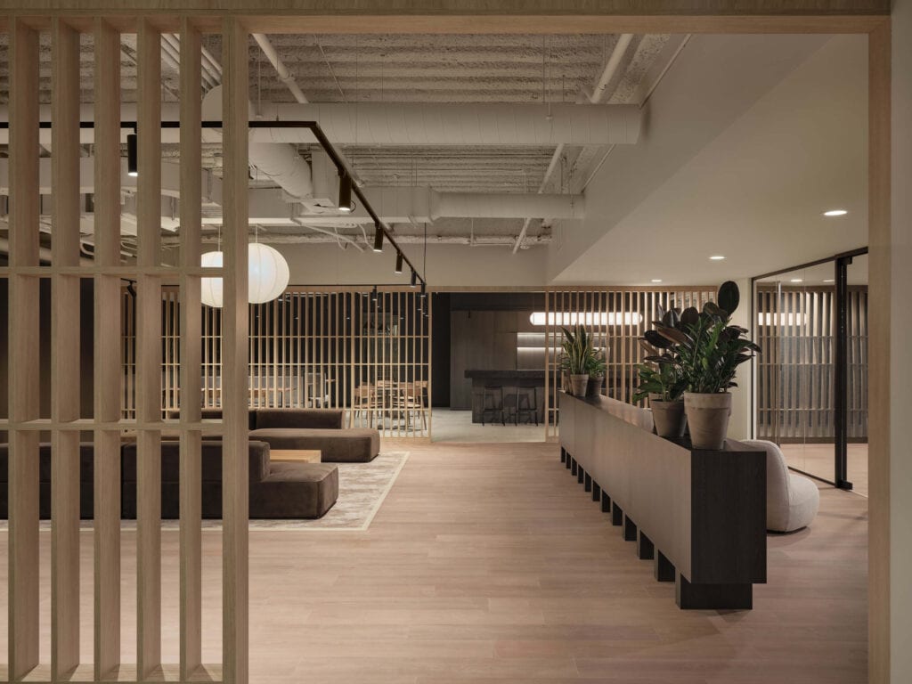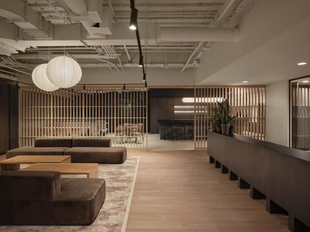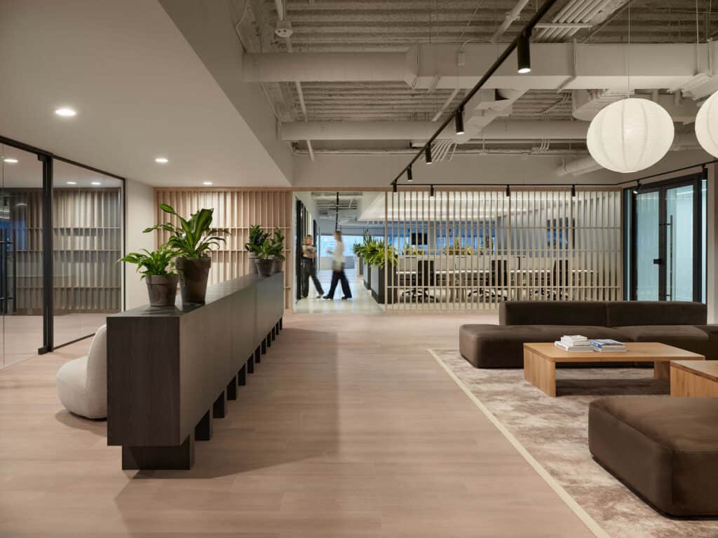 Les moments forts se concentrent autour de l’entrée, cœur du projet, encadrée par des cloisons ajourées qui filtrent les vues et orchestrent une transition douce vers les bureaux ou la cuisine, ainsi que des phone booths intégrés sous une retombée architecturale flottante, repère clair qui structure l’aire ouverte. Un défi majeur a guidé la conception : maîtriser les nuisances sonores, notamment celles des systèmes mécaniques et des zones collaboratives, avec des solutions intégrées et durables.
