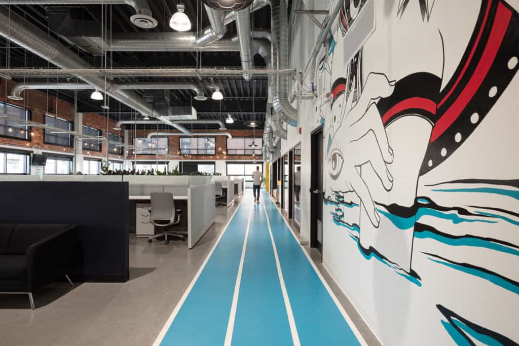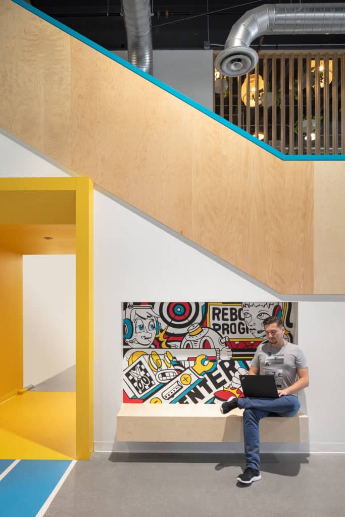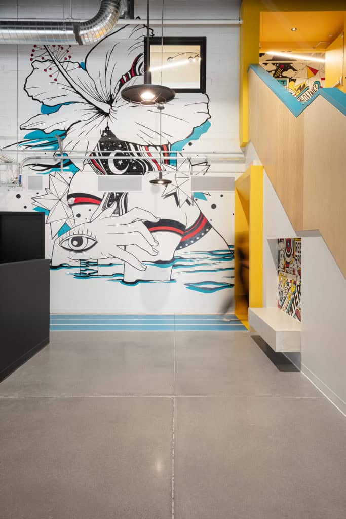 Voici les tout nouveaux bureaux de la compagnie Quadbridge, une compagnie qui accompagne les entreprises pour leurs besoins de support en TI. Étalé sur 16 000 pi2, ce nouvel environnement de travail fait maintenant vibrer la culture humaine de l’entreprise au sein des lieux. On retrouve plusieurs espaces de vie axés sur le bien-être, tels qu’une piste de course, un gym privé, une superbe cafétéria, une zone de jeux et même une toute nouvelle terrasse extérieure pour agrémenter les rassemblements entre collègues! Ce design unique et coloré donne envie aux employés de se déplacer!